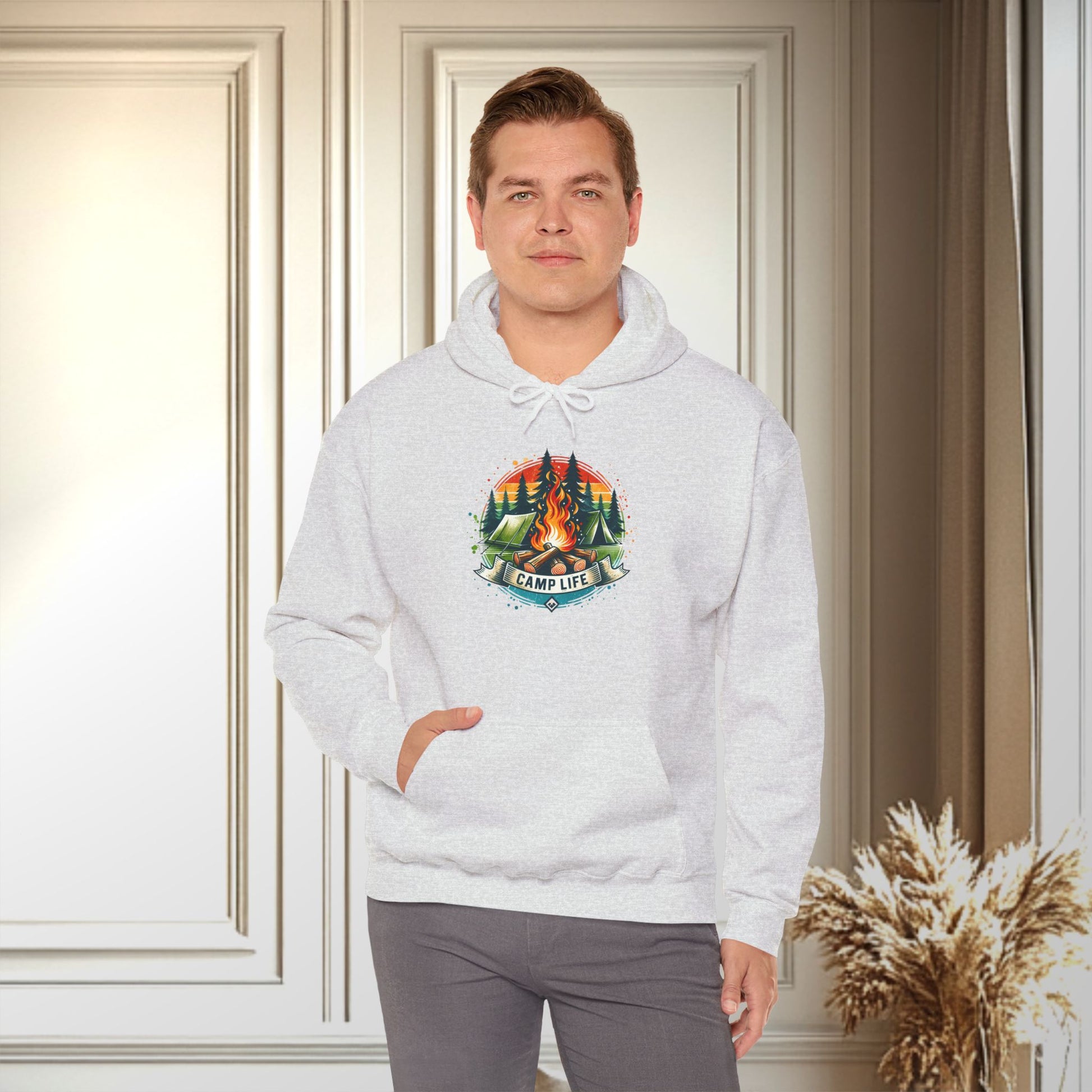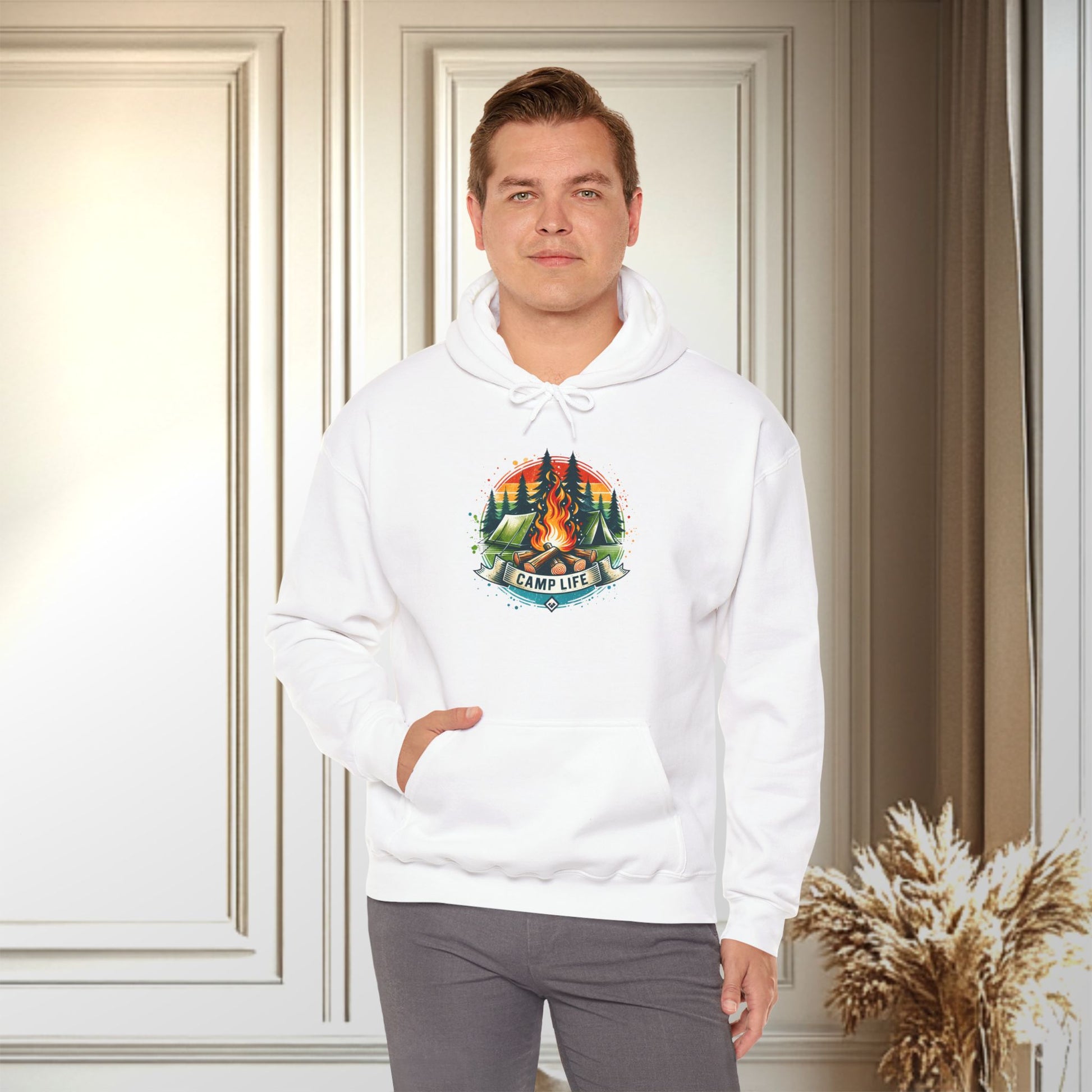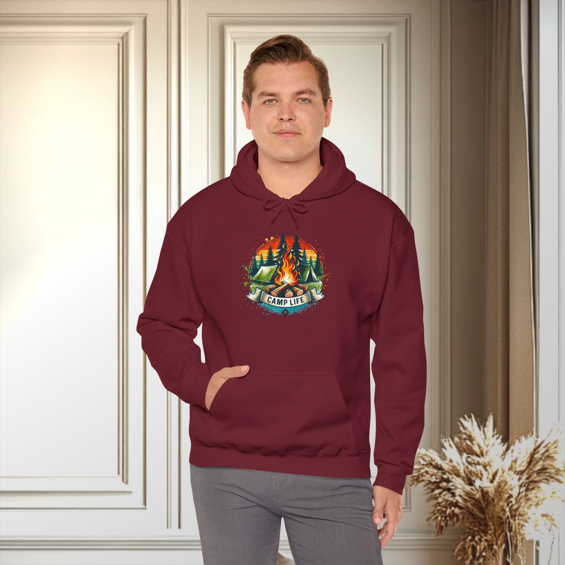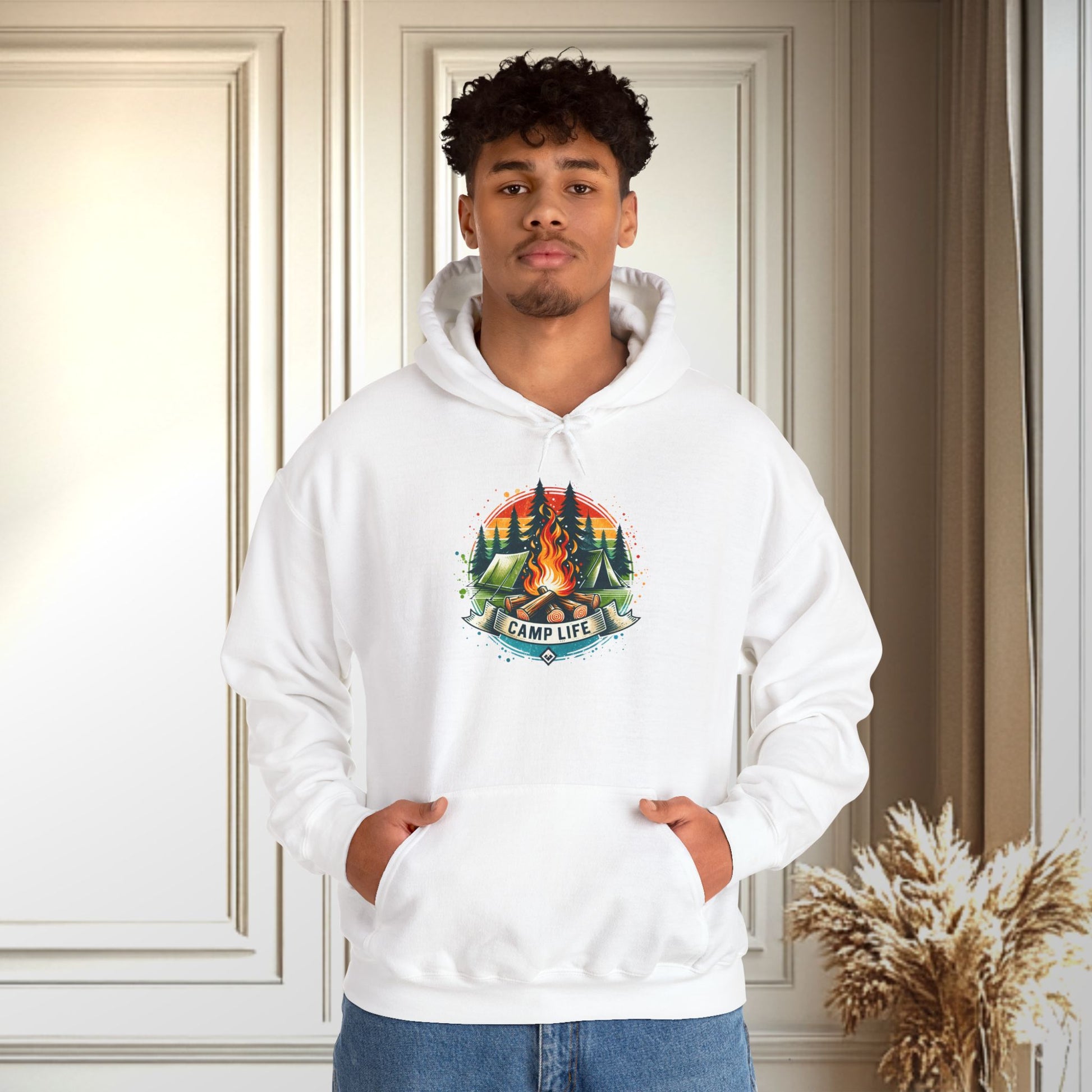 Ready for camping! This unisex heavy blend hooded sweatshirt is relaxation itself. Made with a thick blend of cotton and polyester, it feels plush, soft and warm, a perfect choice for any cold day. In the front, the spacious kangaroo pocket adds daily practicality while the hood's drawstring is the same color as the base sweater for extra style points.