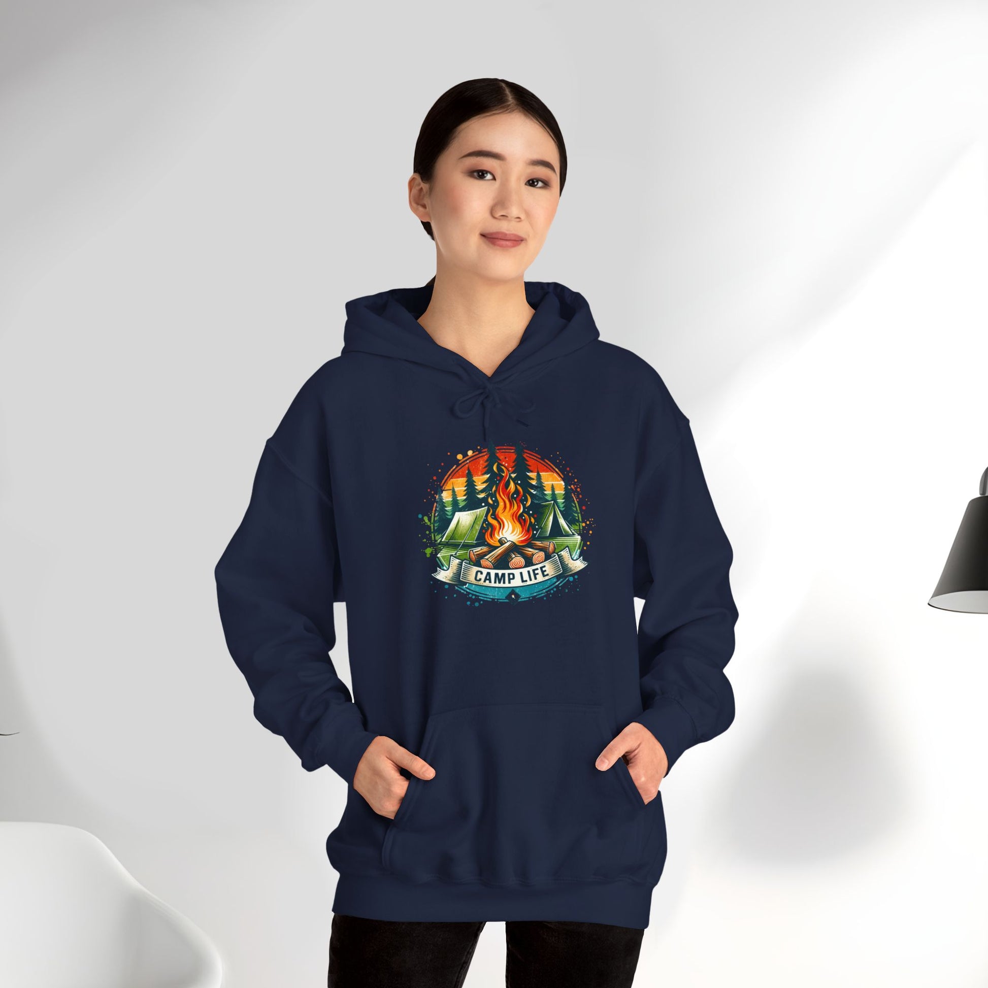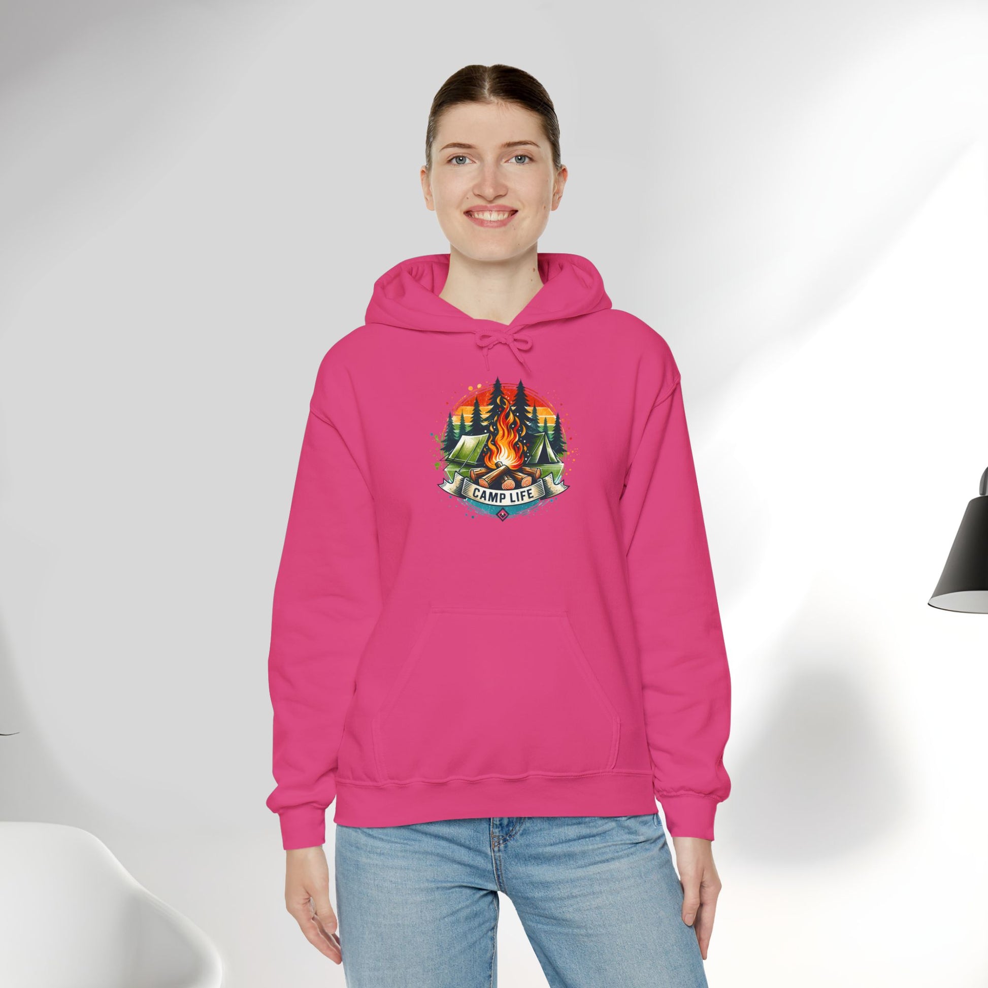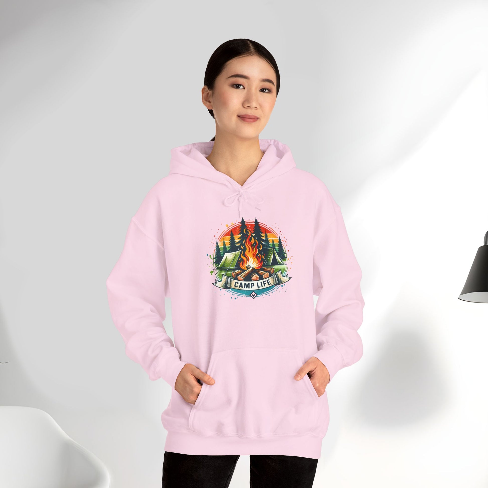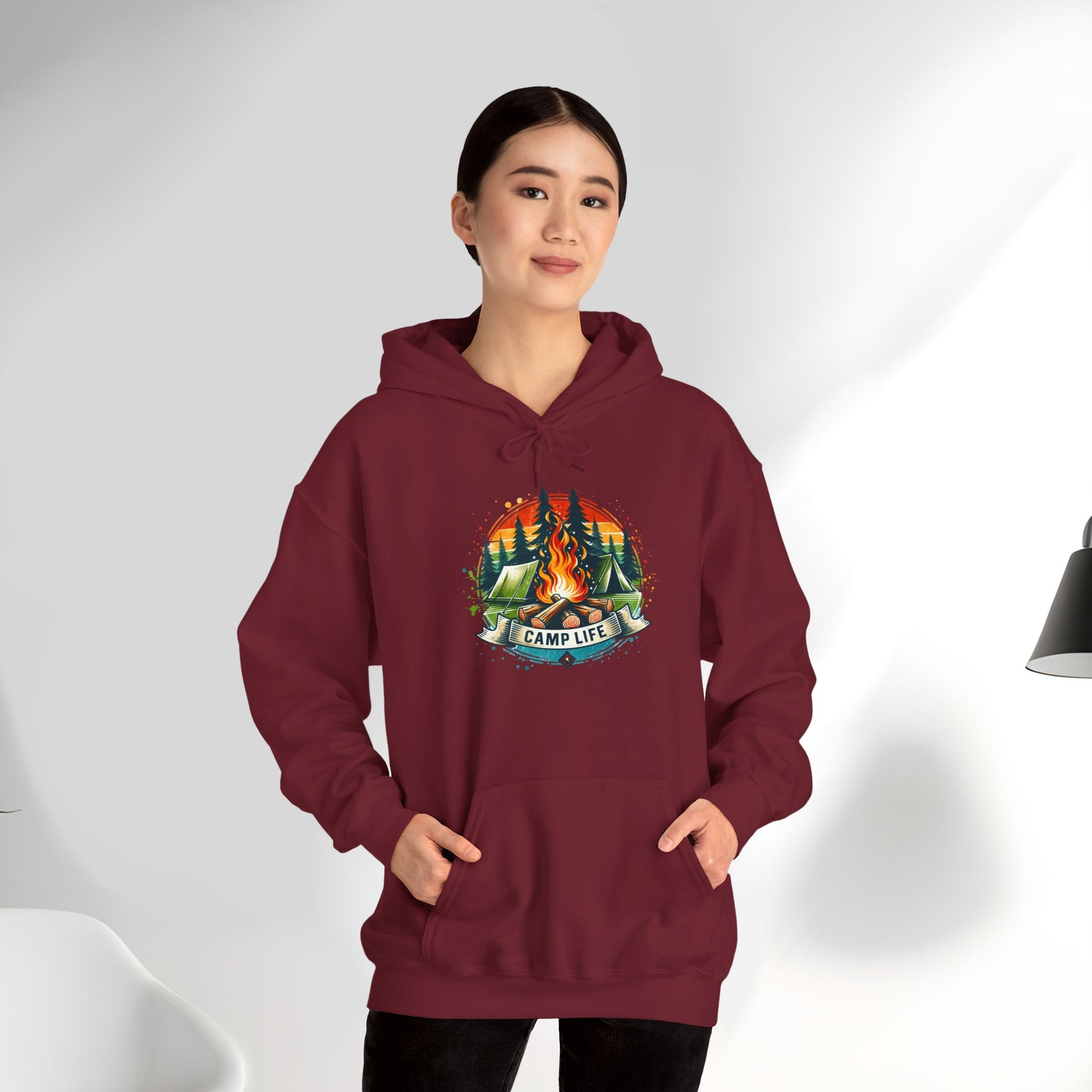 Ready for camping! This unisex heavy blend hooded sweatshirt is relaxation itself. Made with a thick blend of cotton and polyester, it feels plush, soft and warm, a perfect choice for any cold day. In the front, the spacious kangaroo pocket adds daily practicality while the hood's drawstring is the same color as the base sweater for extra style points.