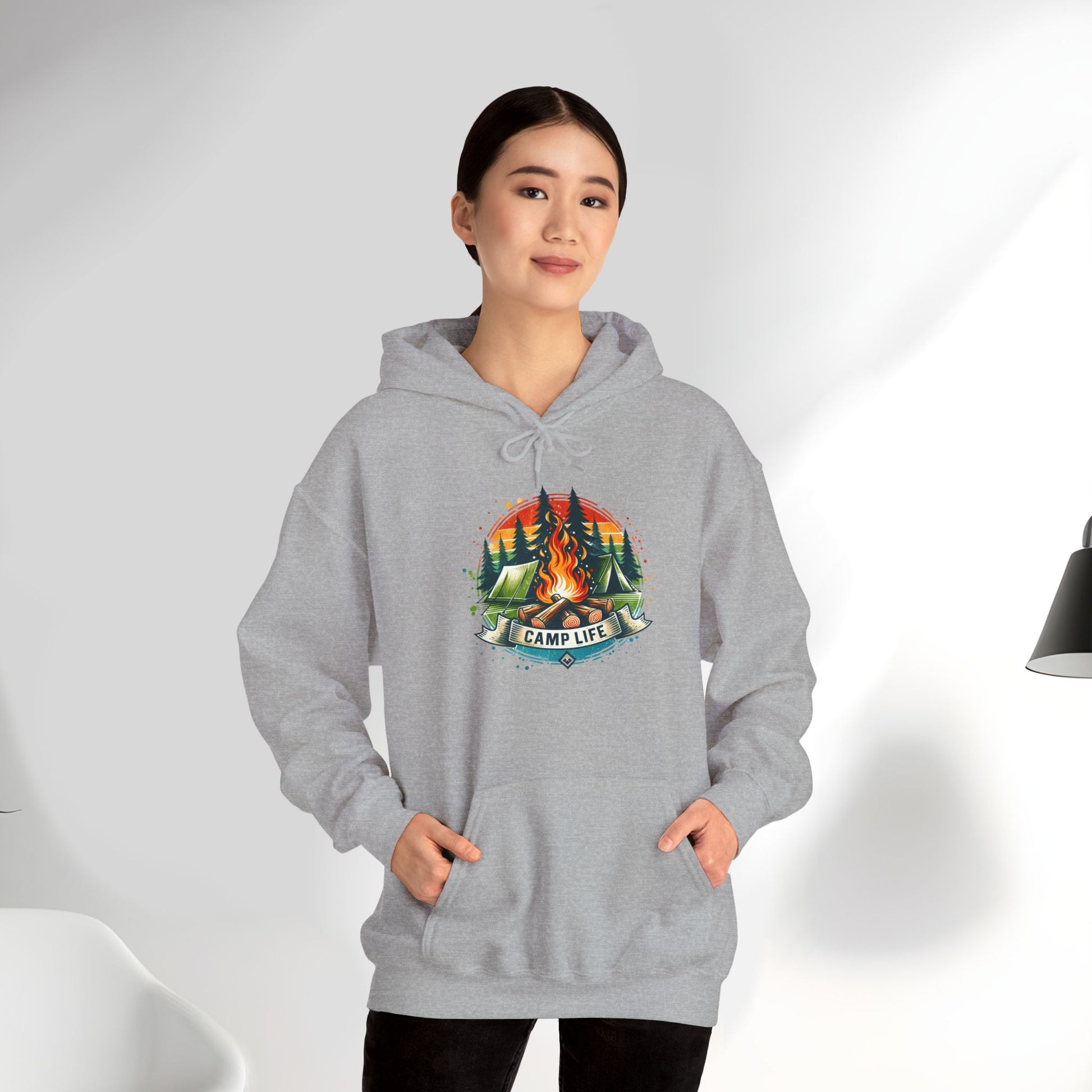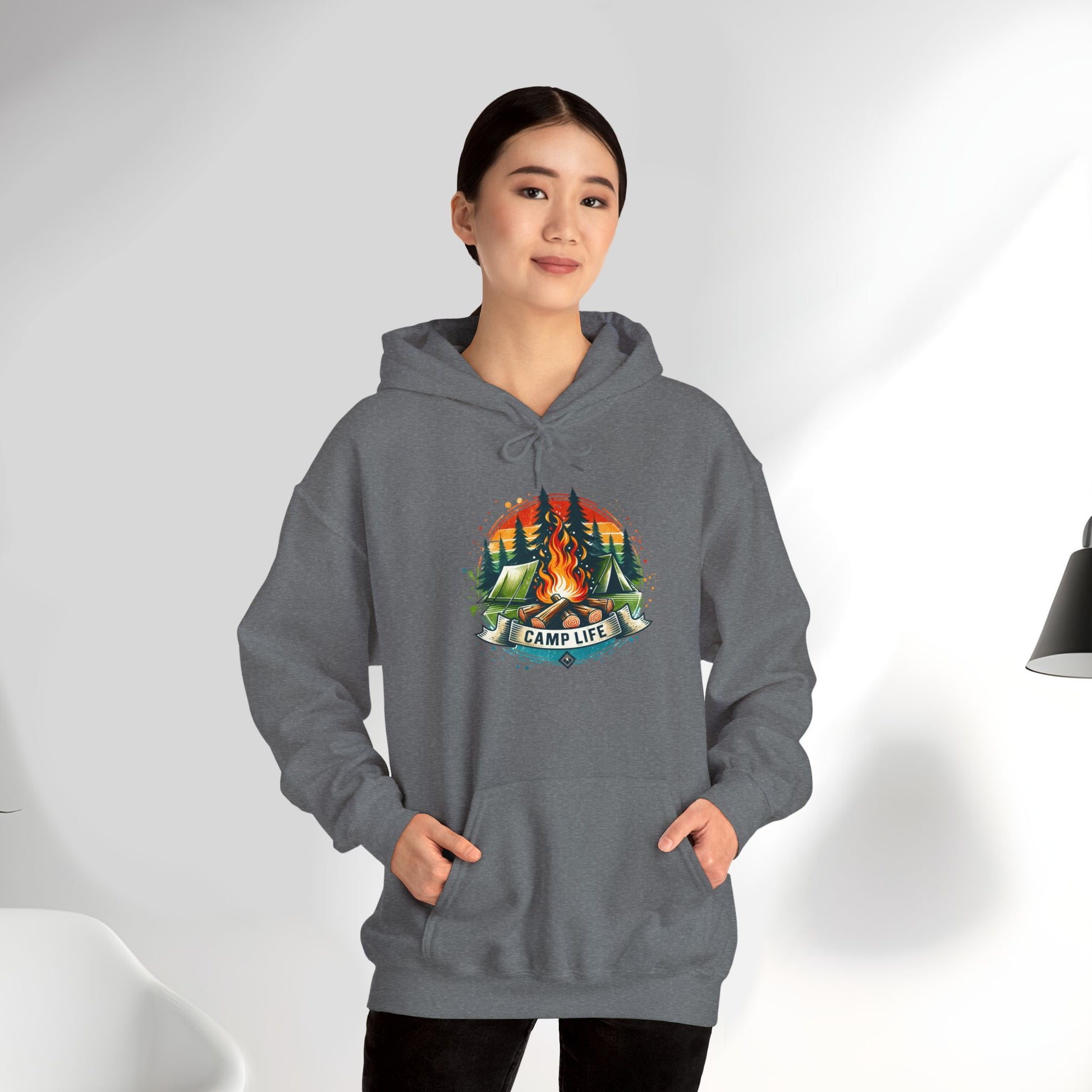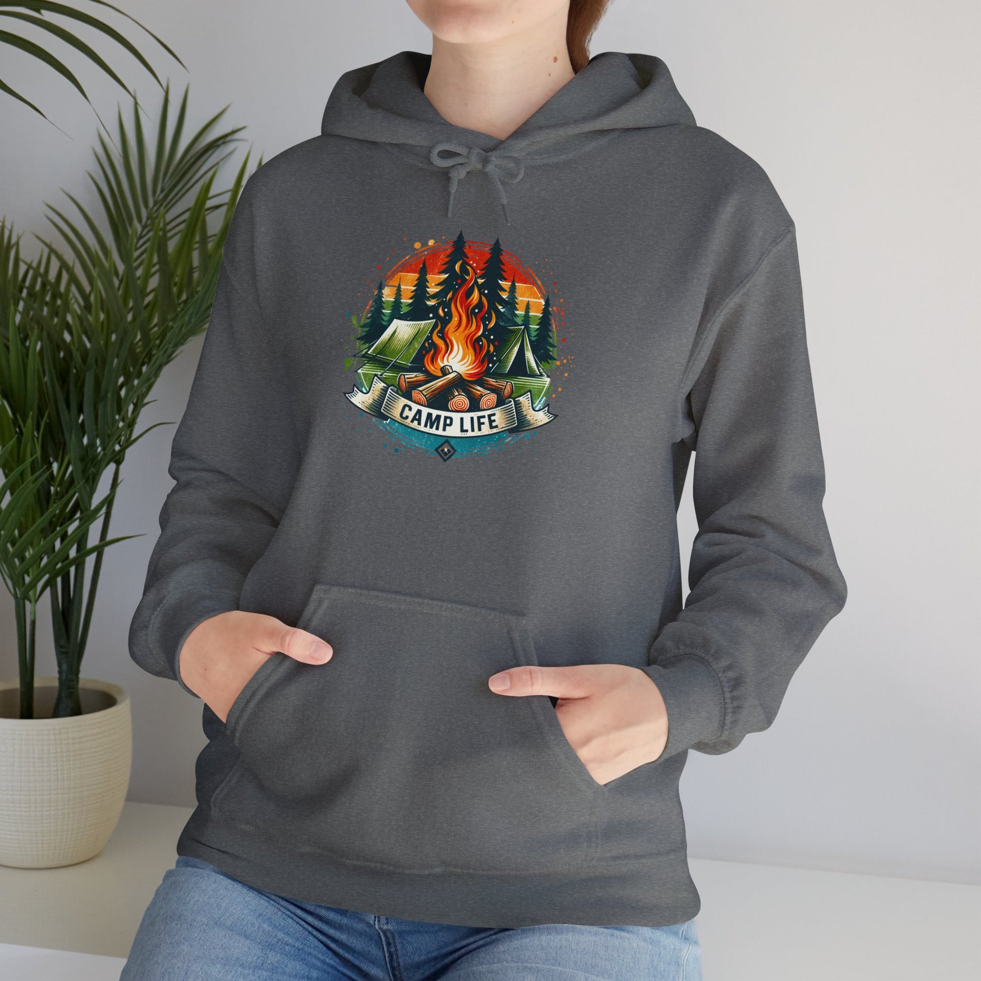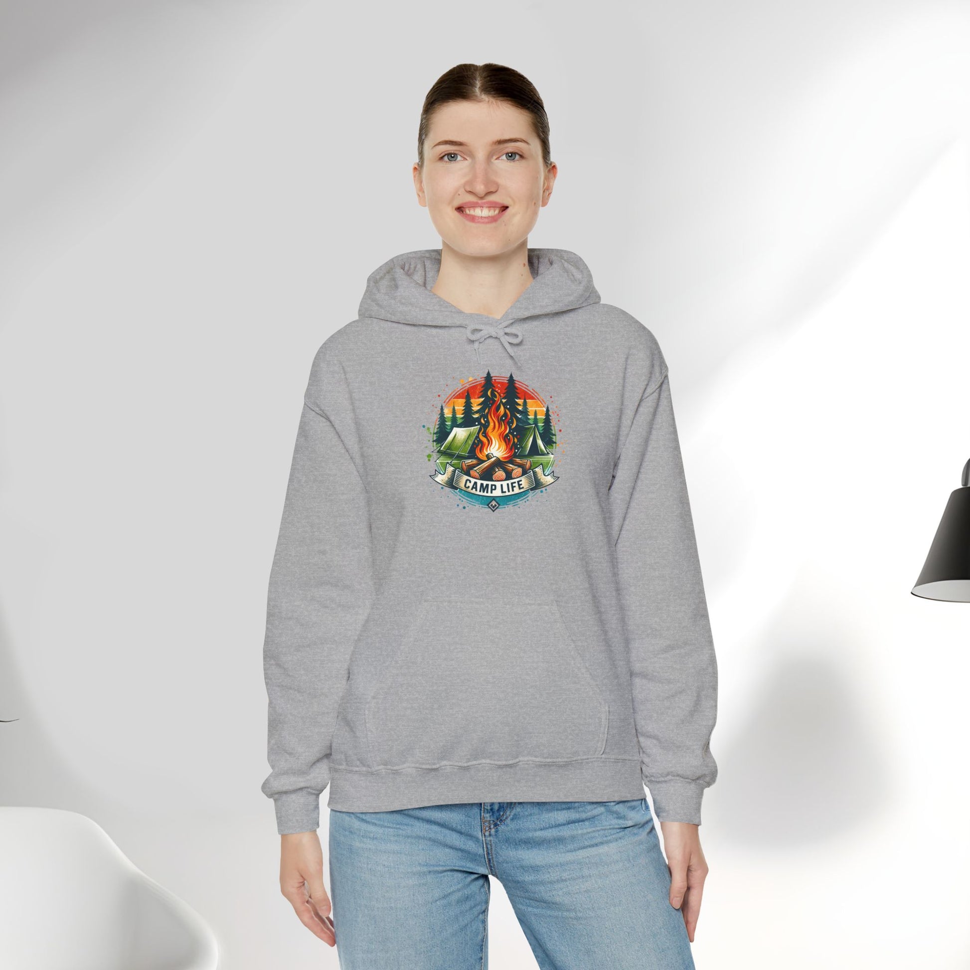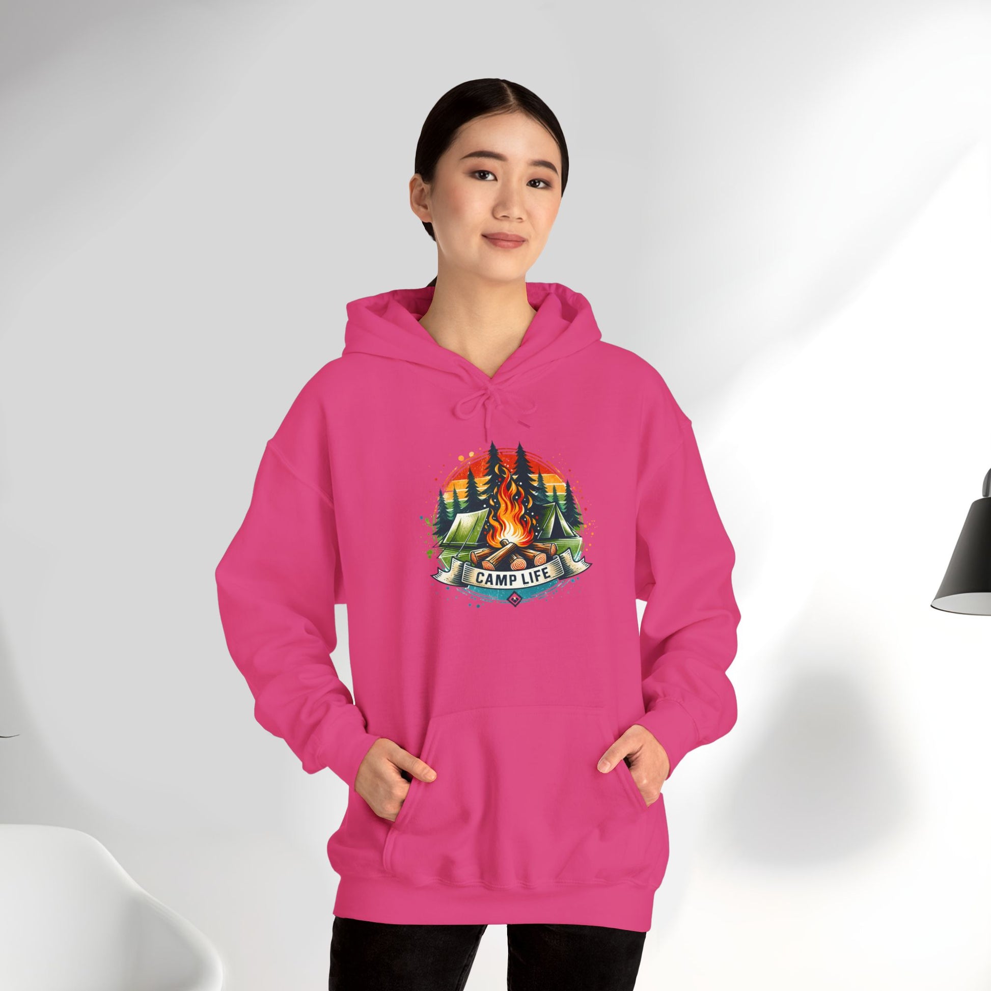 Ready for camping! This unisex heavy blend hooded sweatshirt is relaxation itself. Made with a thick blend of cotton and polyester, it feels plush, soft and warm, a perfect choice for any cold day. In the front, the spacious kangaroo pocket adds daily practicality while the hood's drawstring is the same color as the base sweater for extra style points.