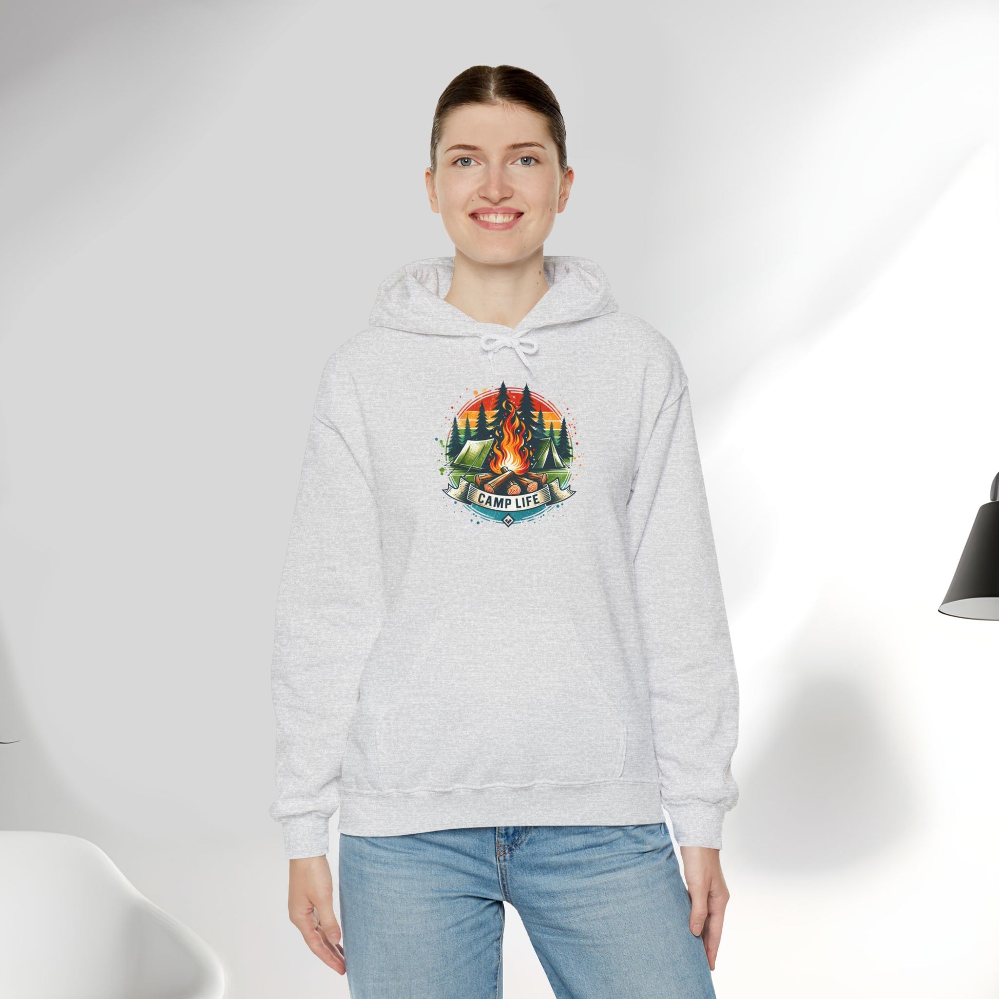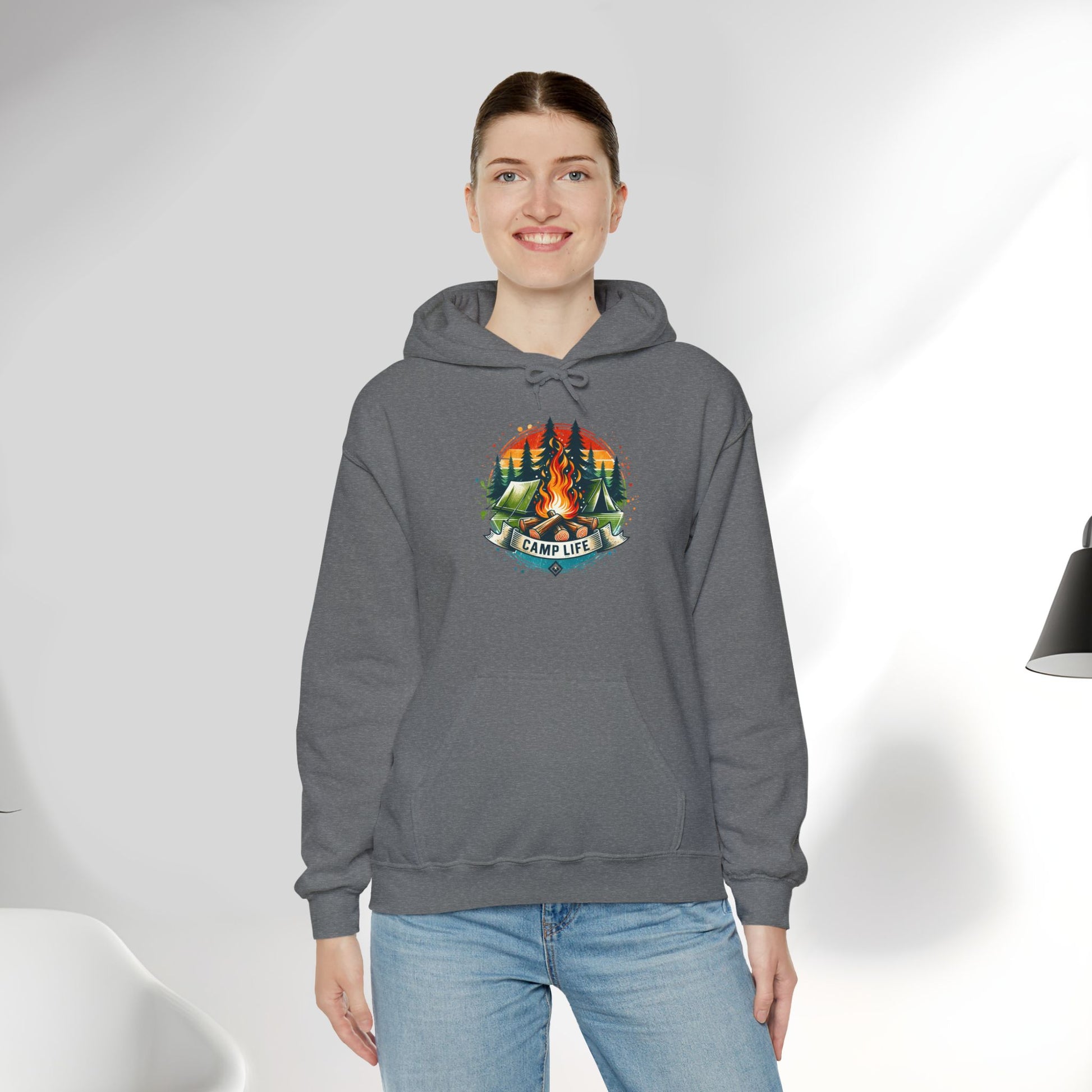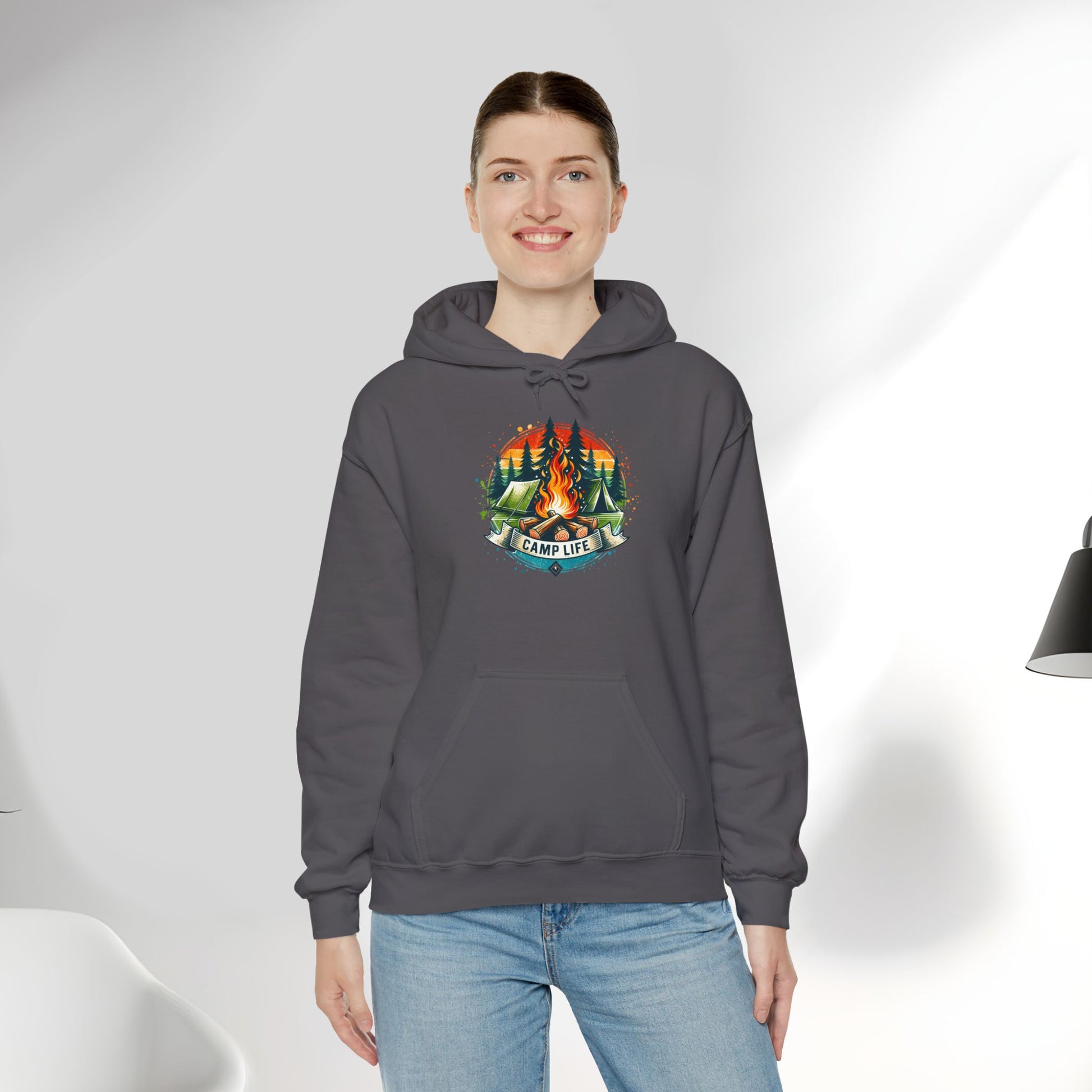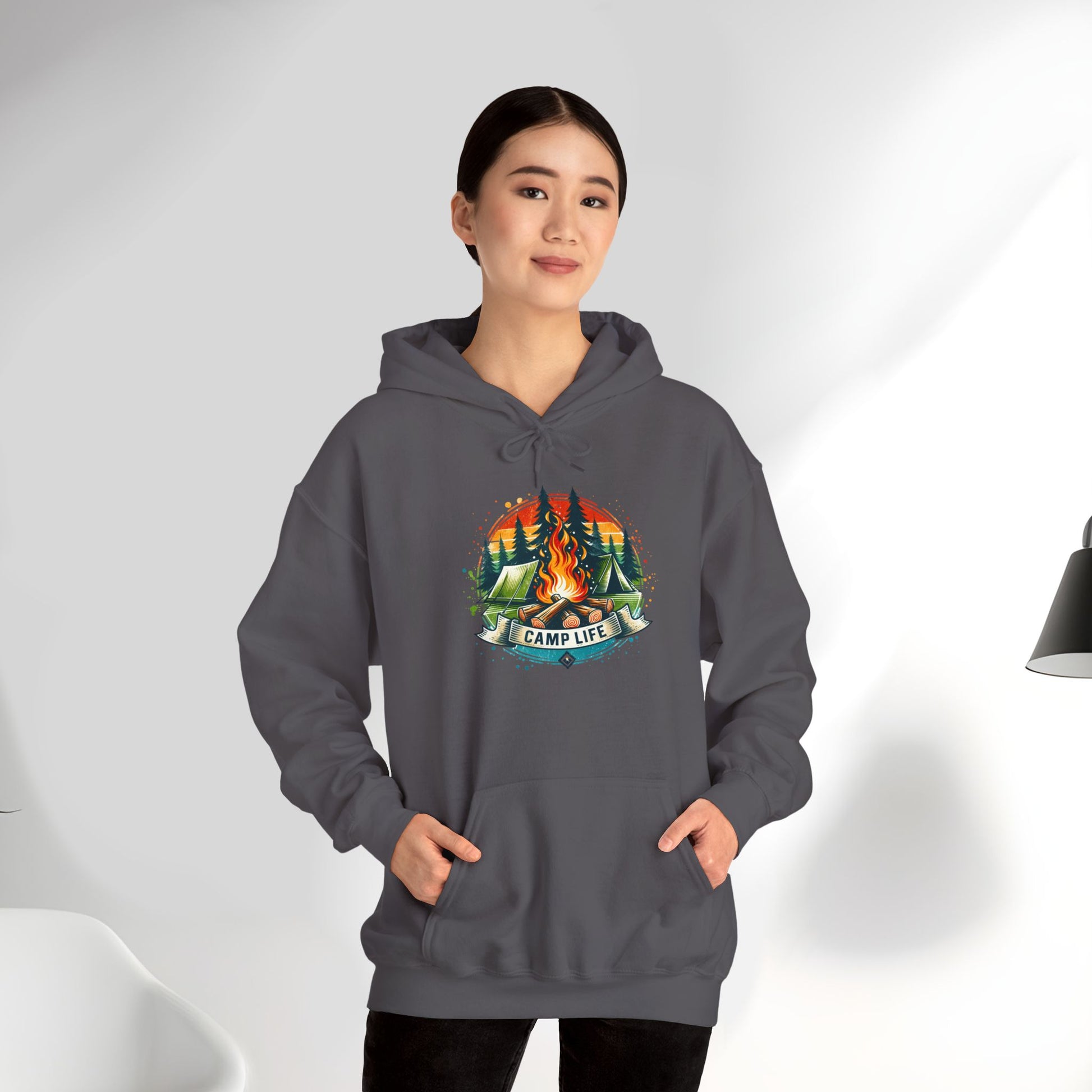 Ready for camping! This unisex heavy blend hooded sweatshirt is relaxation itself. Made with a thick blend of cotton and polyester, it feels plush, soft and warm, a perfect choice for any cold day. In the front, the spacious kangaroo pocket adds daily practicality while the hood's drawstring is the same color as the base sweater for extra style points.