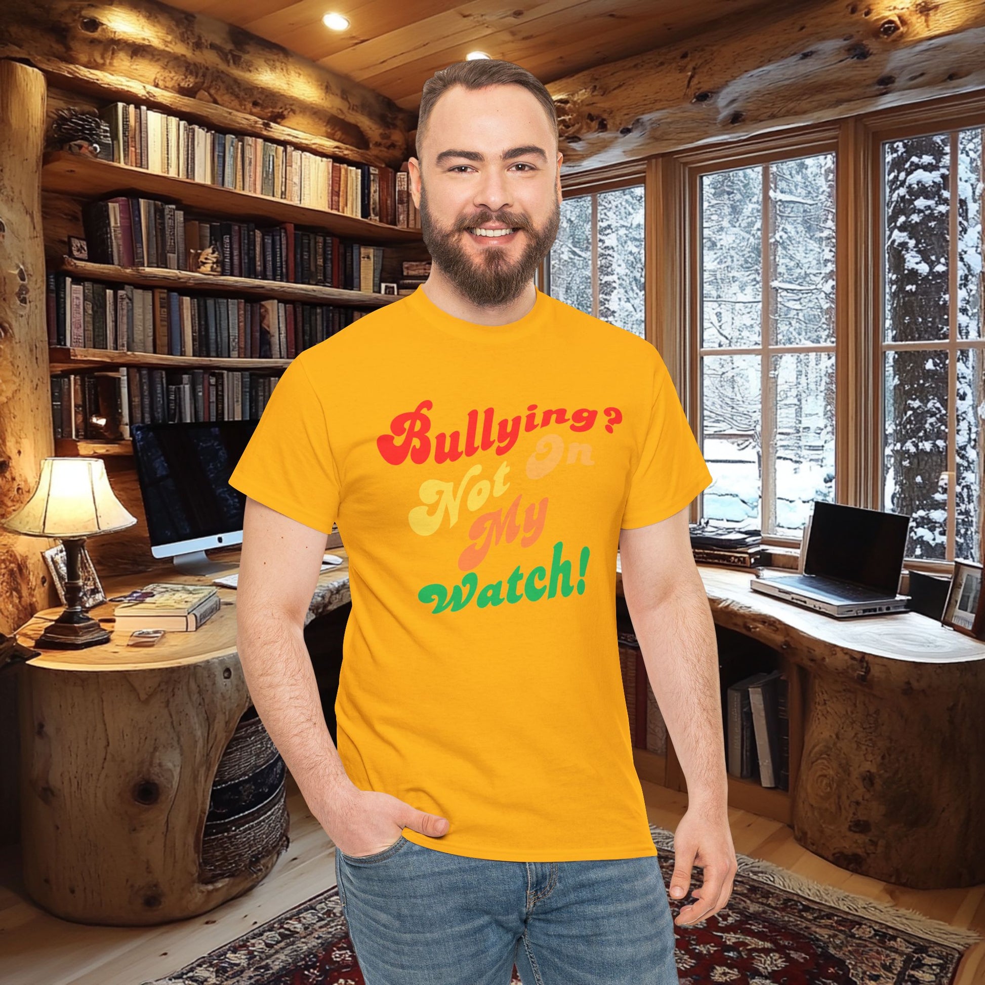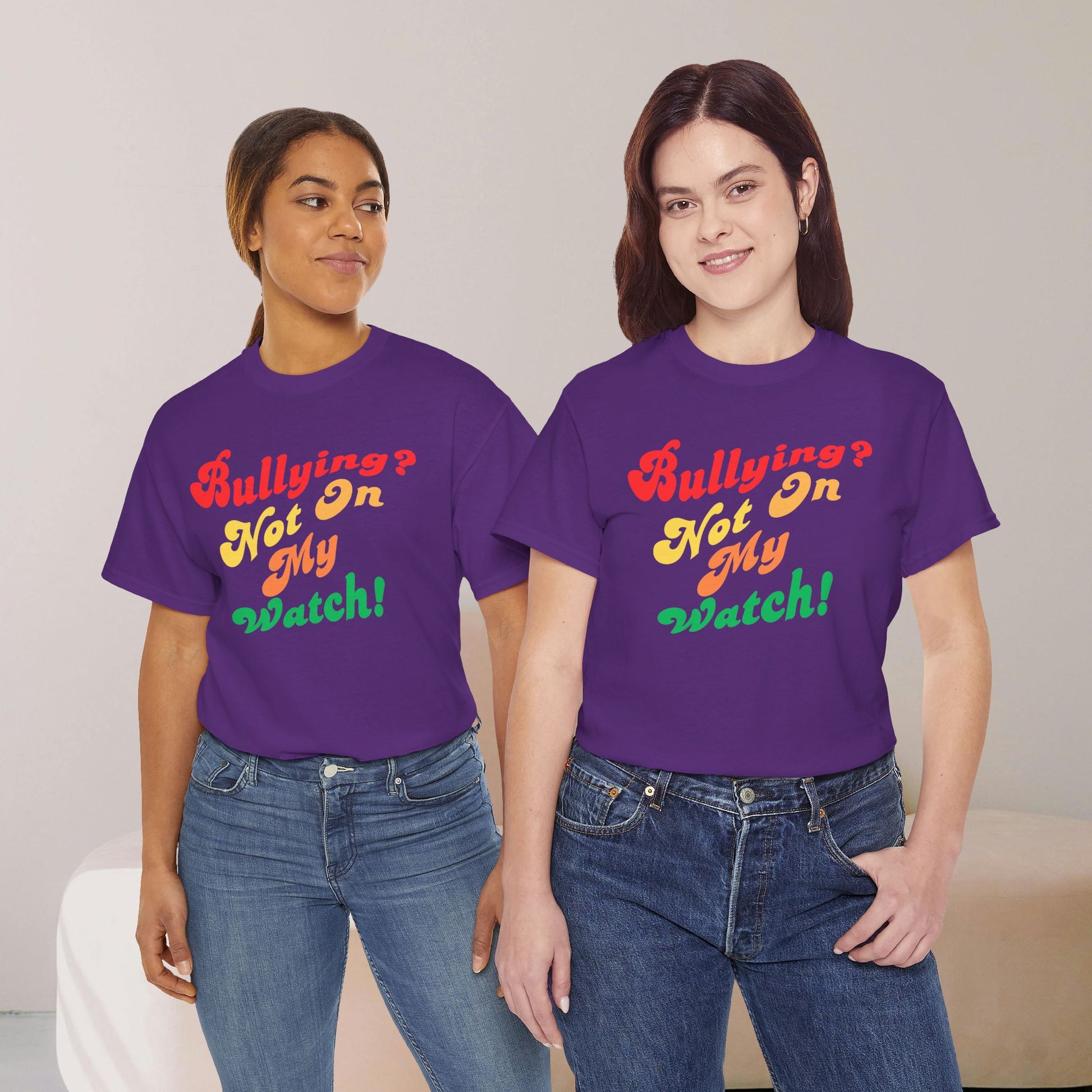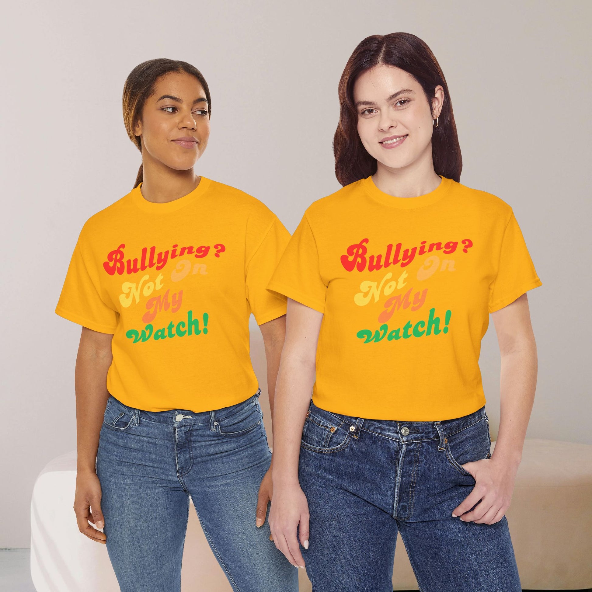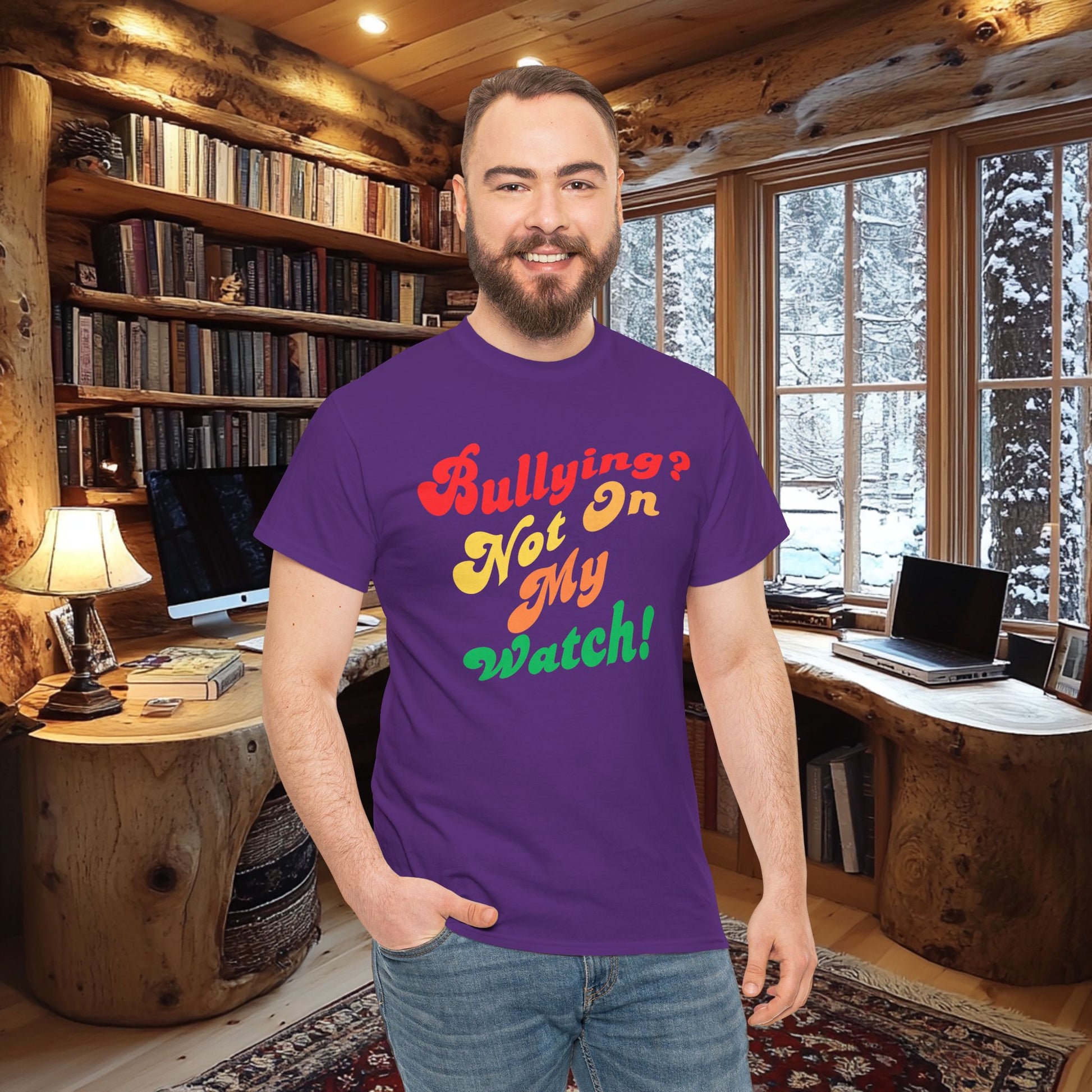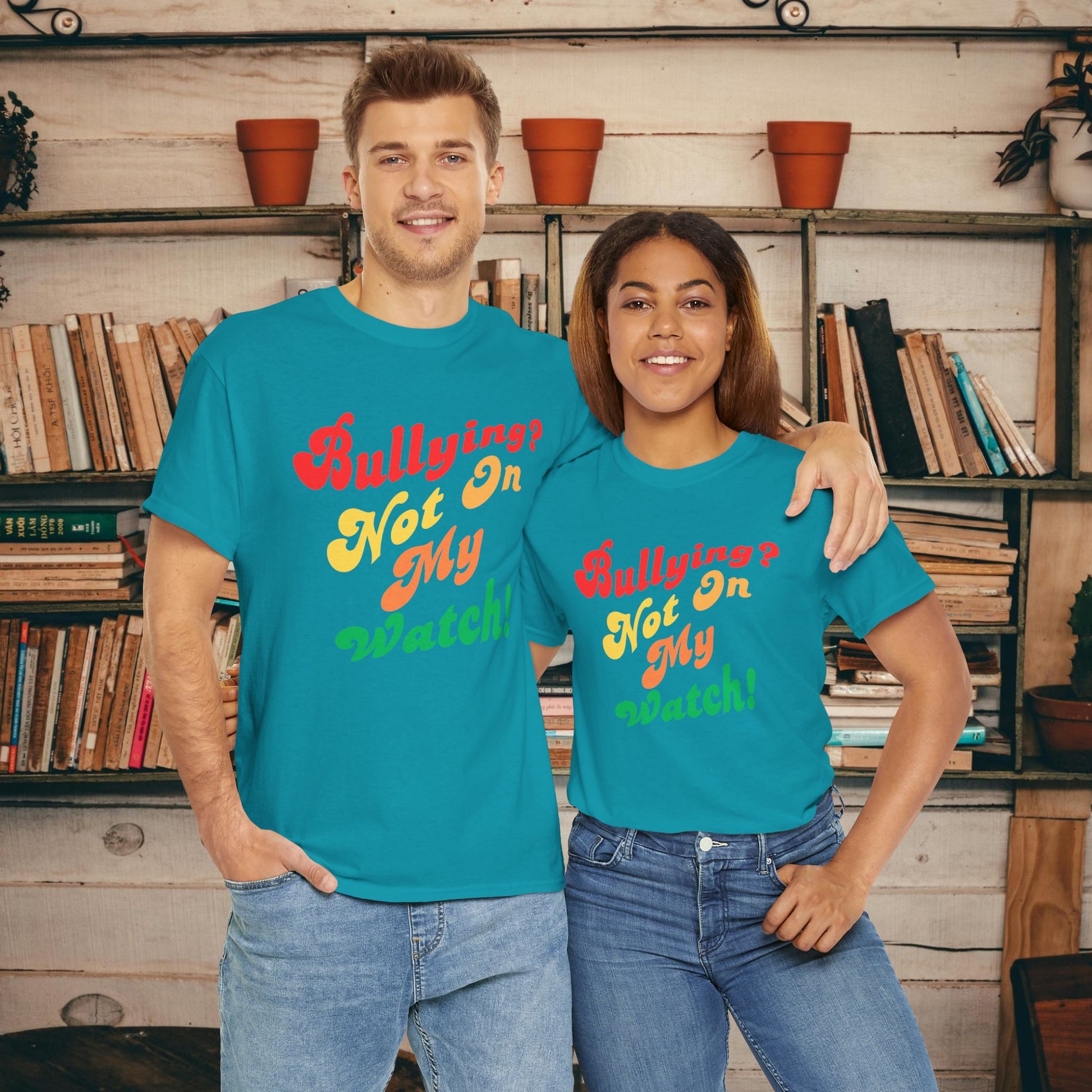 Help stop the bullying! The unisex heavy cotton tee is the basic staple of any wardrobe. It is the foundation upon which casual fashion grows. All it needs is a personalized design to elevate things to profitability. The specially spun fibers provide a smooth surface for premium printing vividity and sharpness. No side seams mean there are no itchy interruptions under the arms. The shoulders have tape for improved durability.