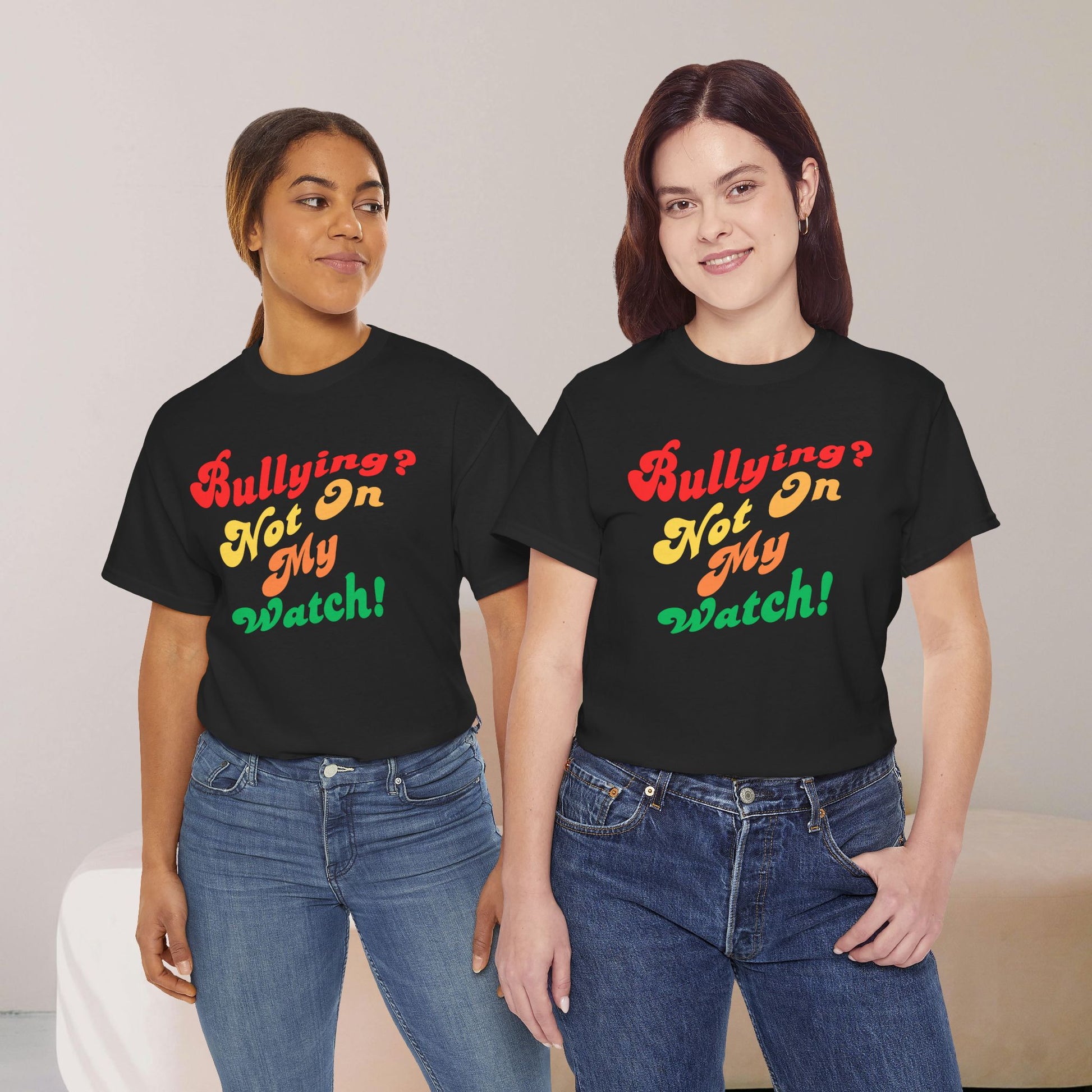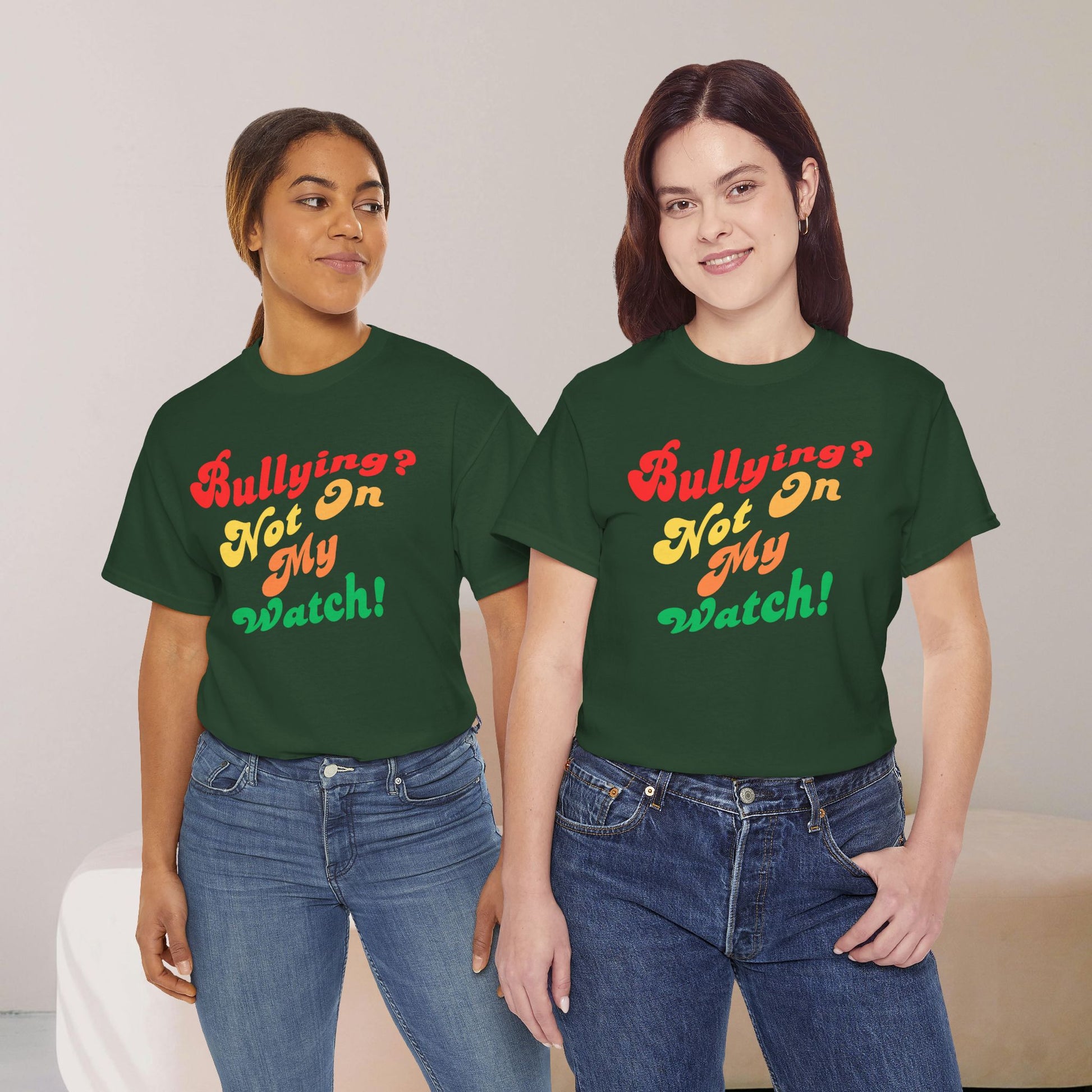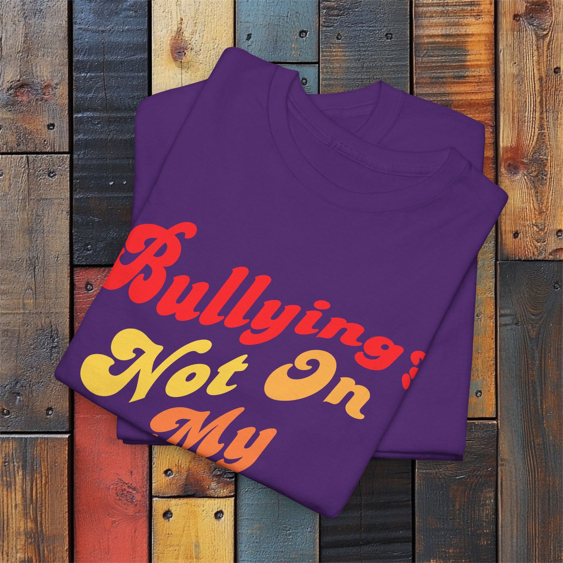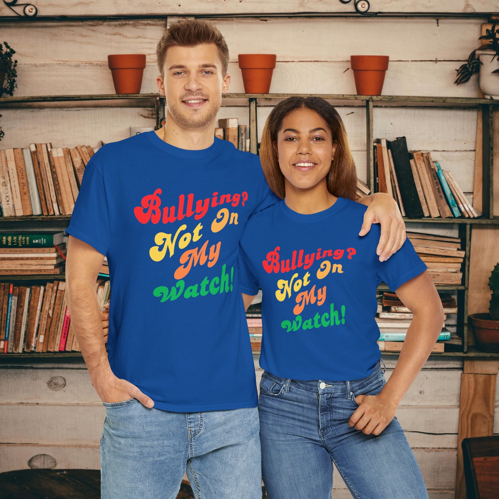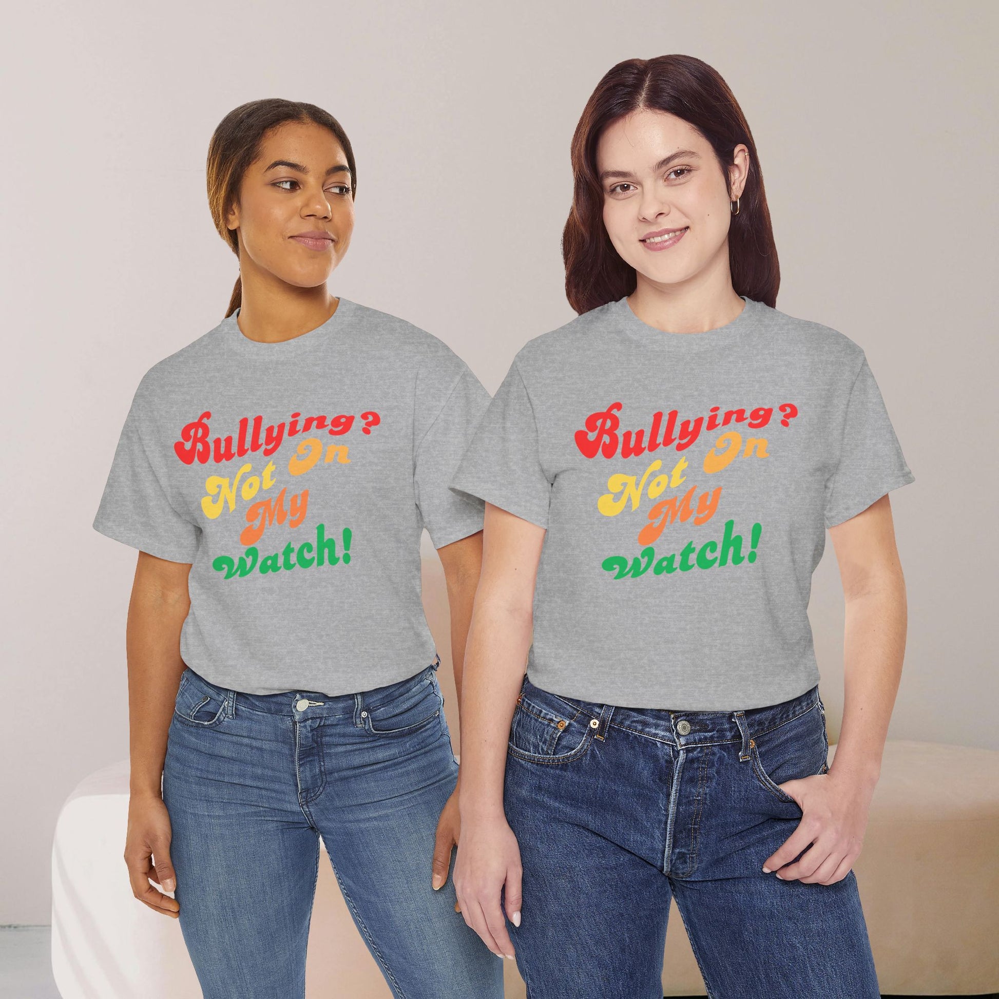 Help stop the bullying! The unisex heavy cotton tee is the basic staple of any wardrobe. It is the foundation upon which casual fashion grows. All it needs is a personalized design to elevate things to profitability. The specially spun fibers provide a smooth surface for premium printing vividity and sharpness. No side seams mean there are no itchy interruptions under the arms. The shoulders have tape for improved durability.