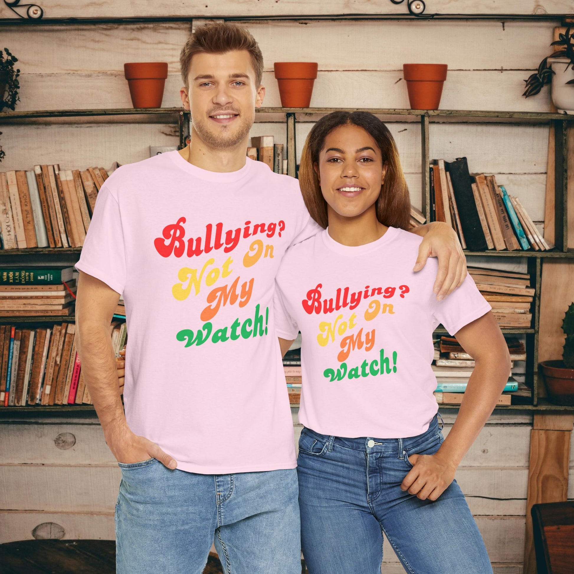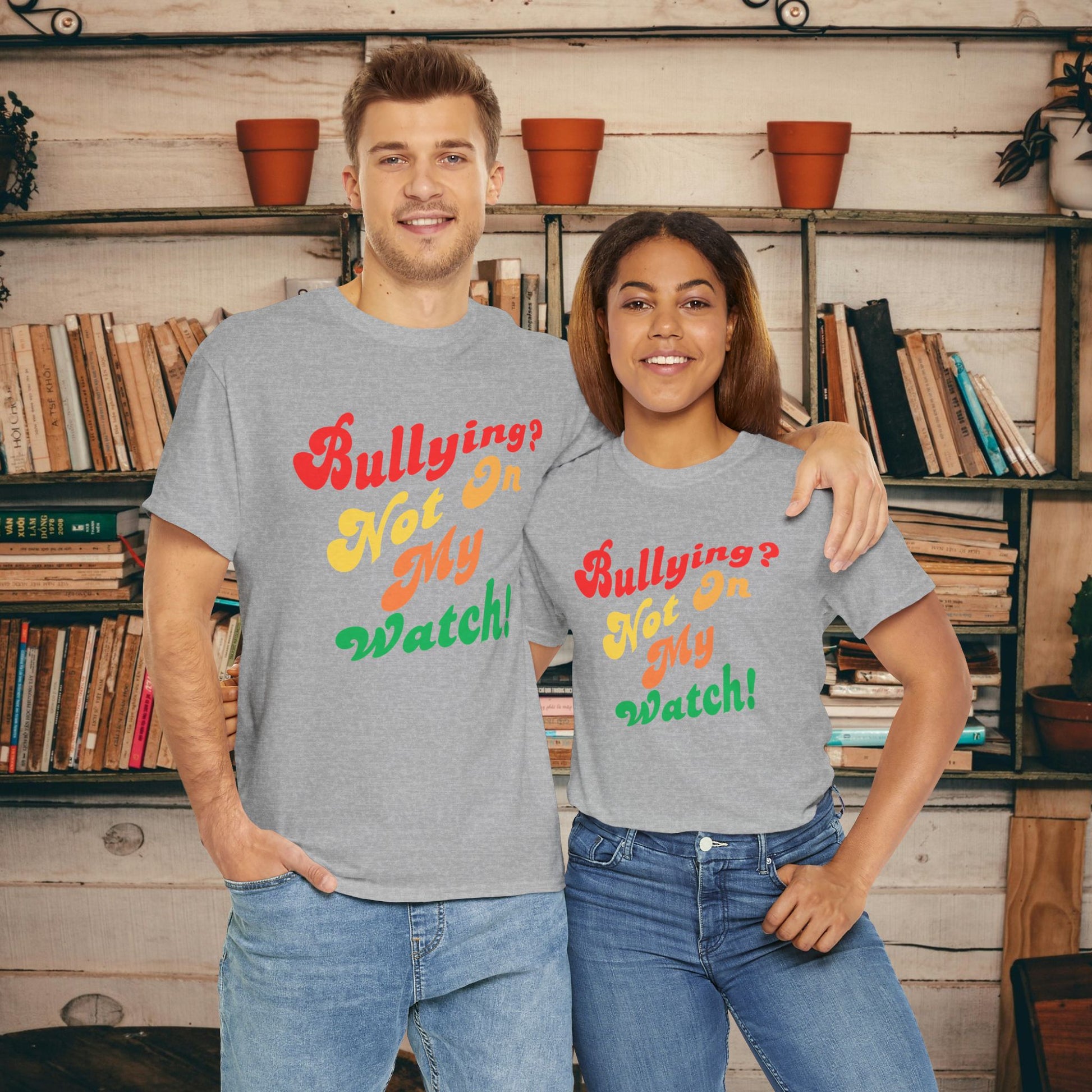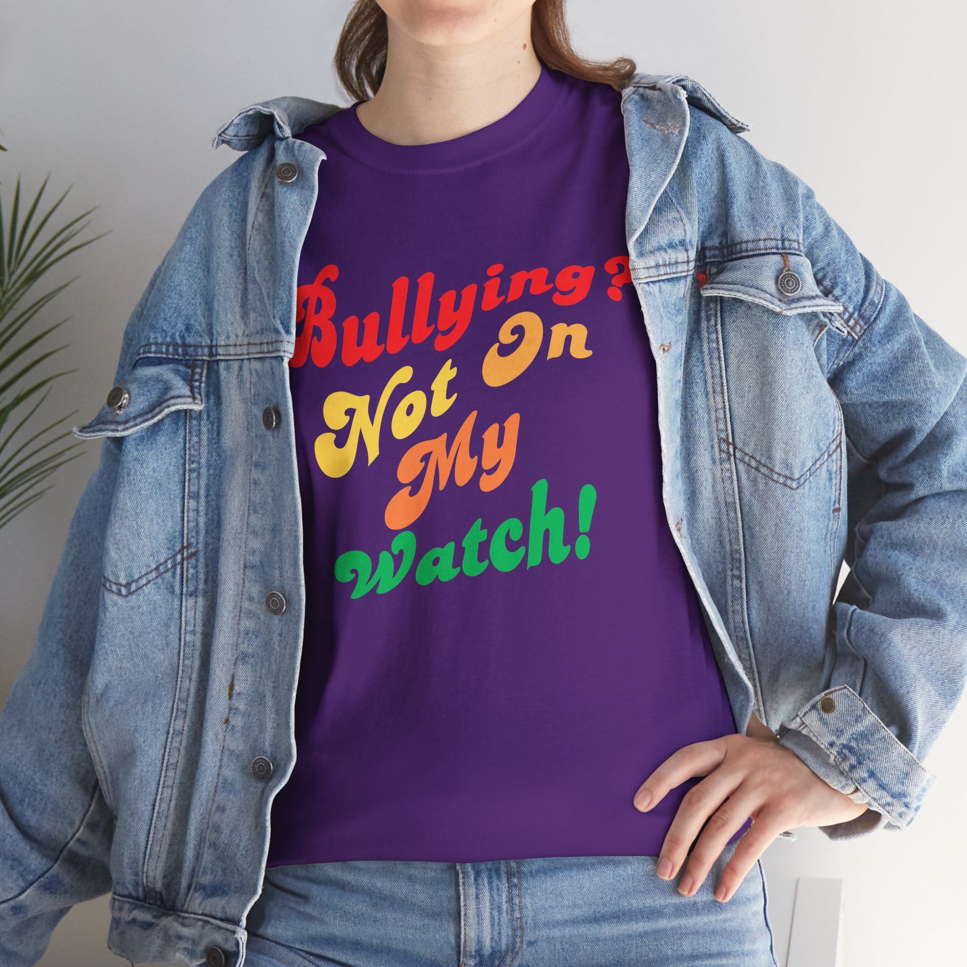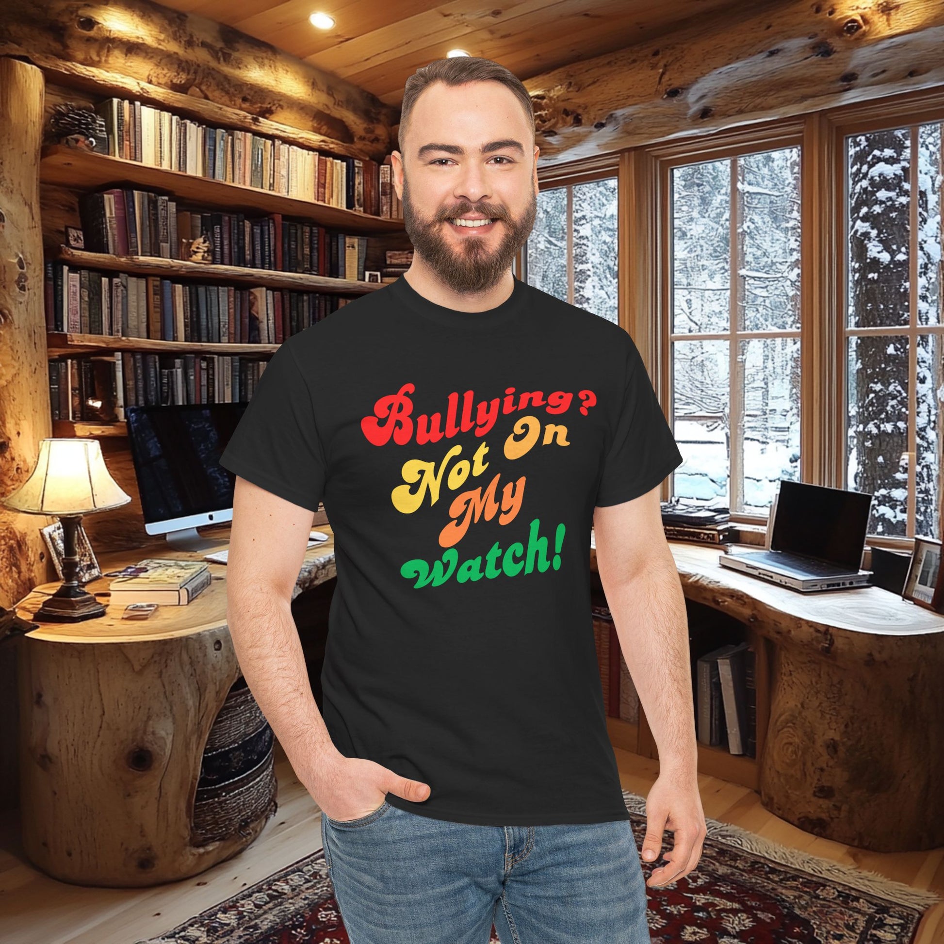 Help stop the bullying! The unisex heavy cotton tee is the basic staple of any wardrobe. It is the foundation upon which casual fashion grows. All it needs is a personalized design to elevate things to profitability. The specially spun fibers provide a smooth surface for premium printing vividity and sharpness. No side seams mean there are no itchy interruptions under the arms. The shoulders have tape for improved durability.