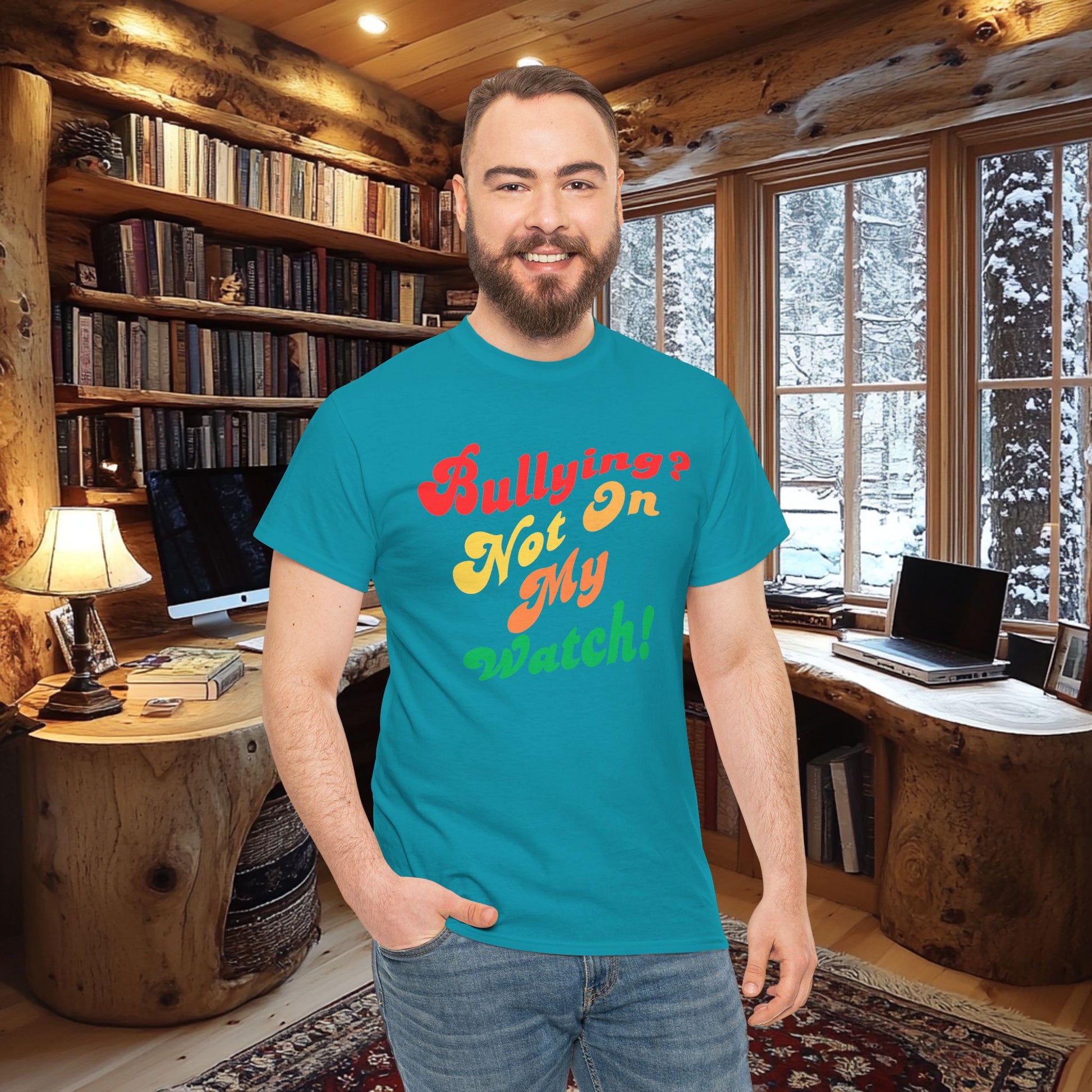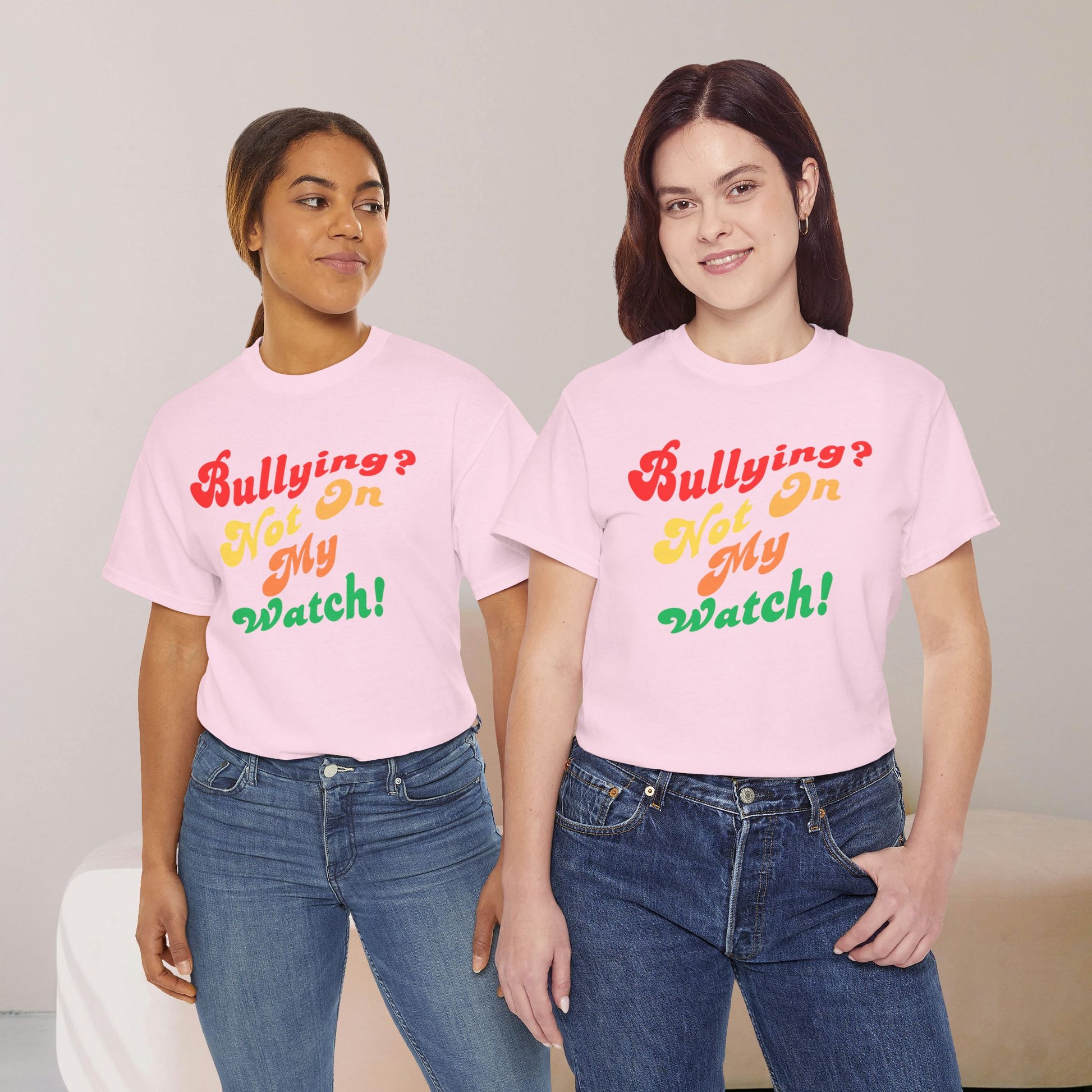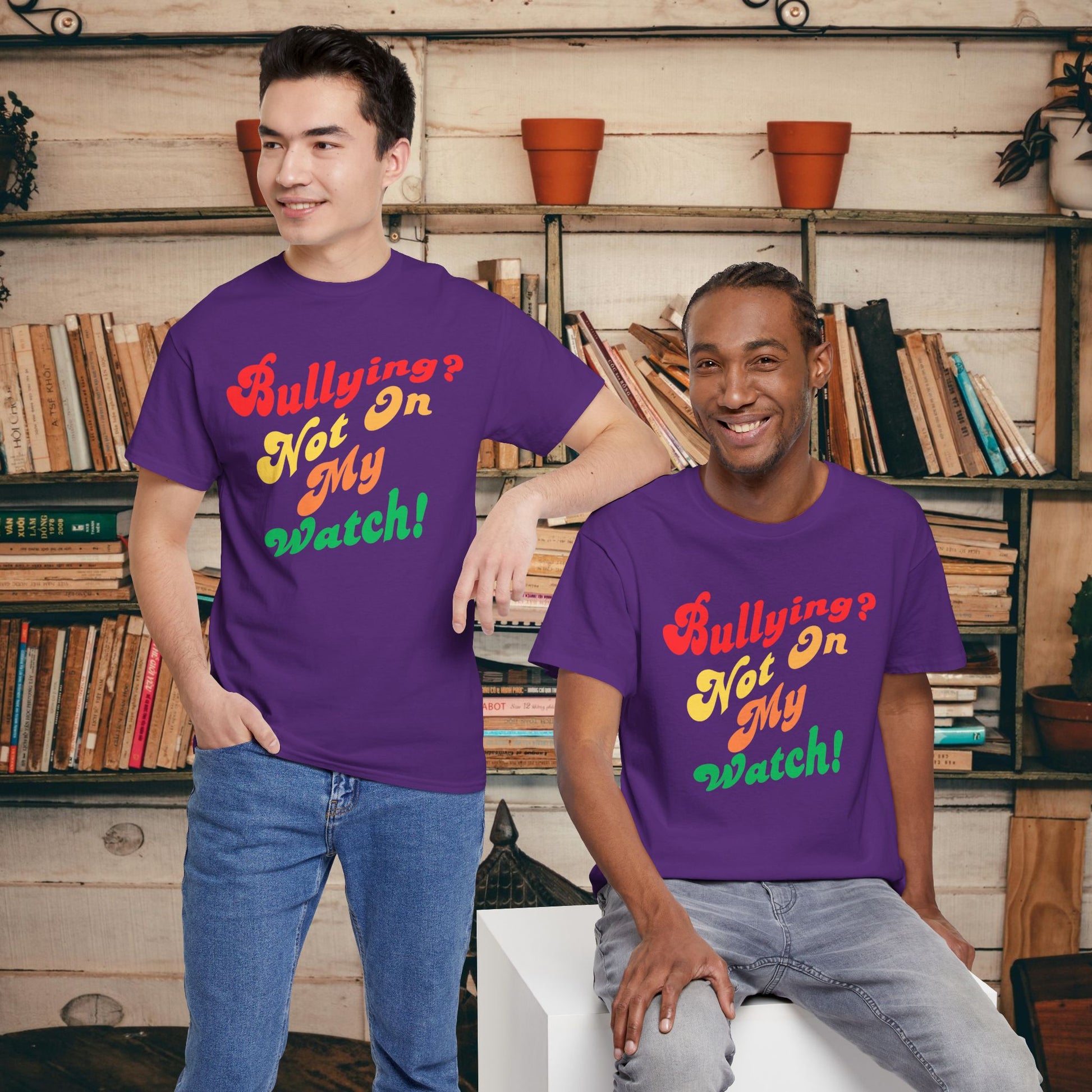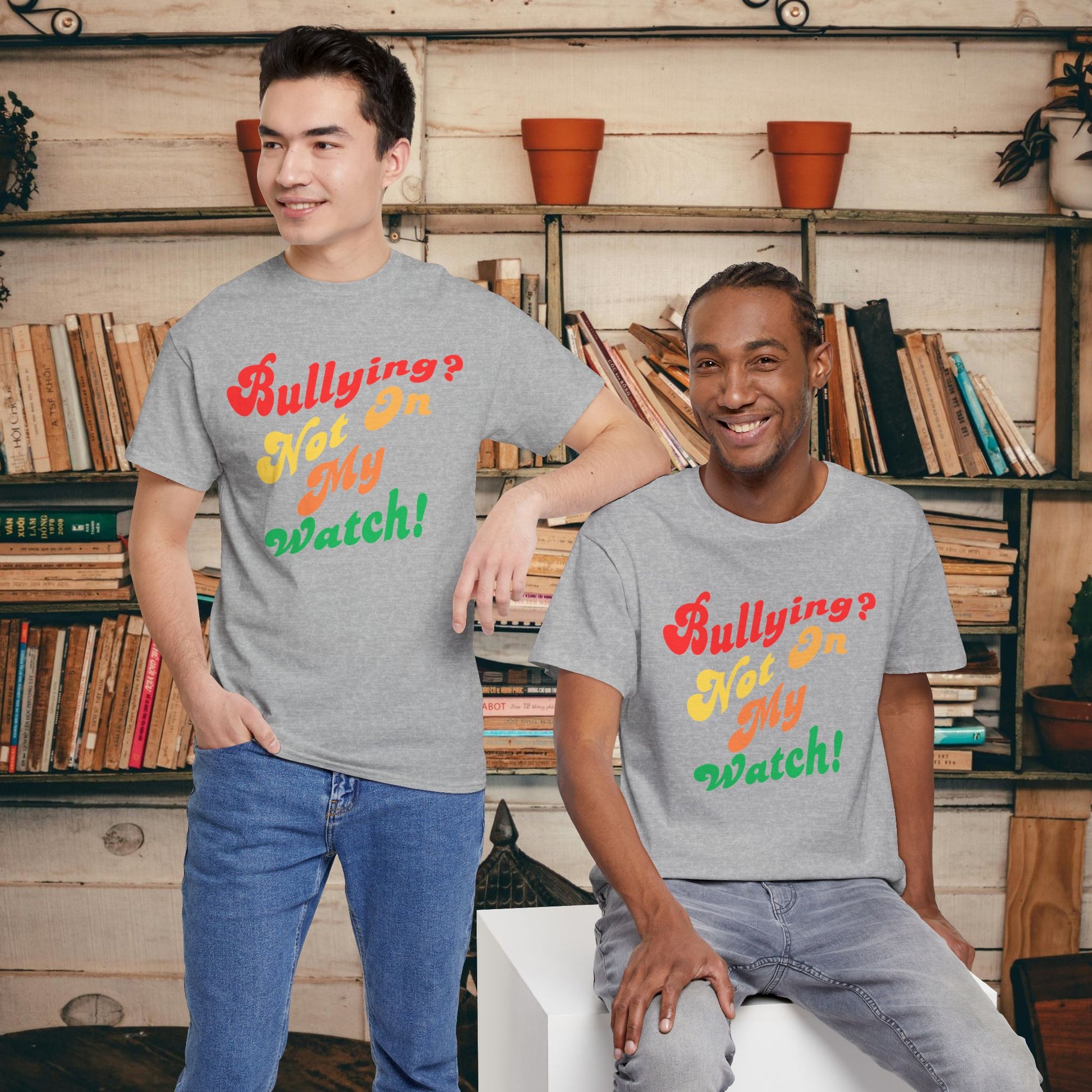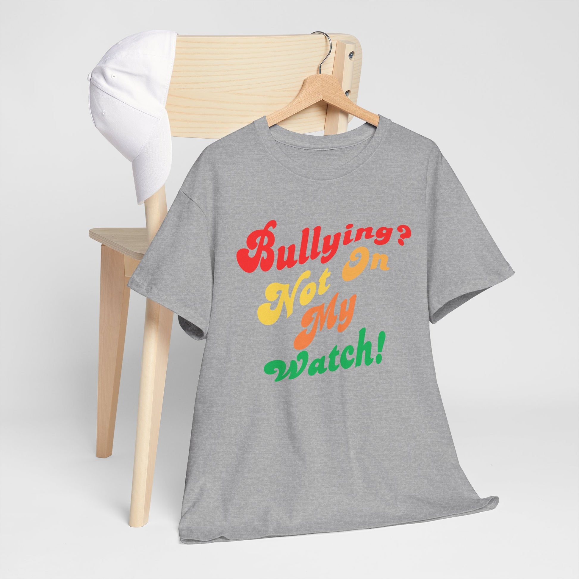 Help stop the bullying! The unisex heavy cotton tee is the basic staple of any wardrobe. It is the foundation upon which casual fashion grows. All it needs is a personalized design to elevate things to profitability. The specially spun fibers provide a smooth surface for premium printing vividity and sharpness. No side seams mean there are no itchy interruptions under the arms. The shoulders have tape for improved durability.