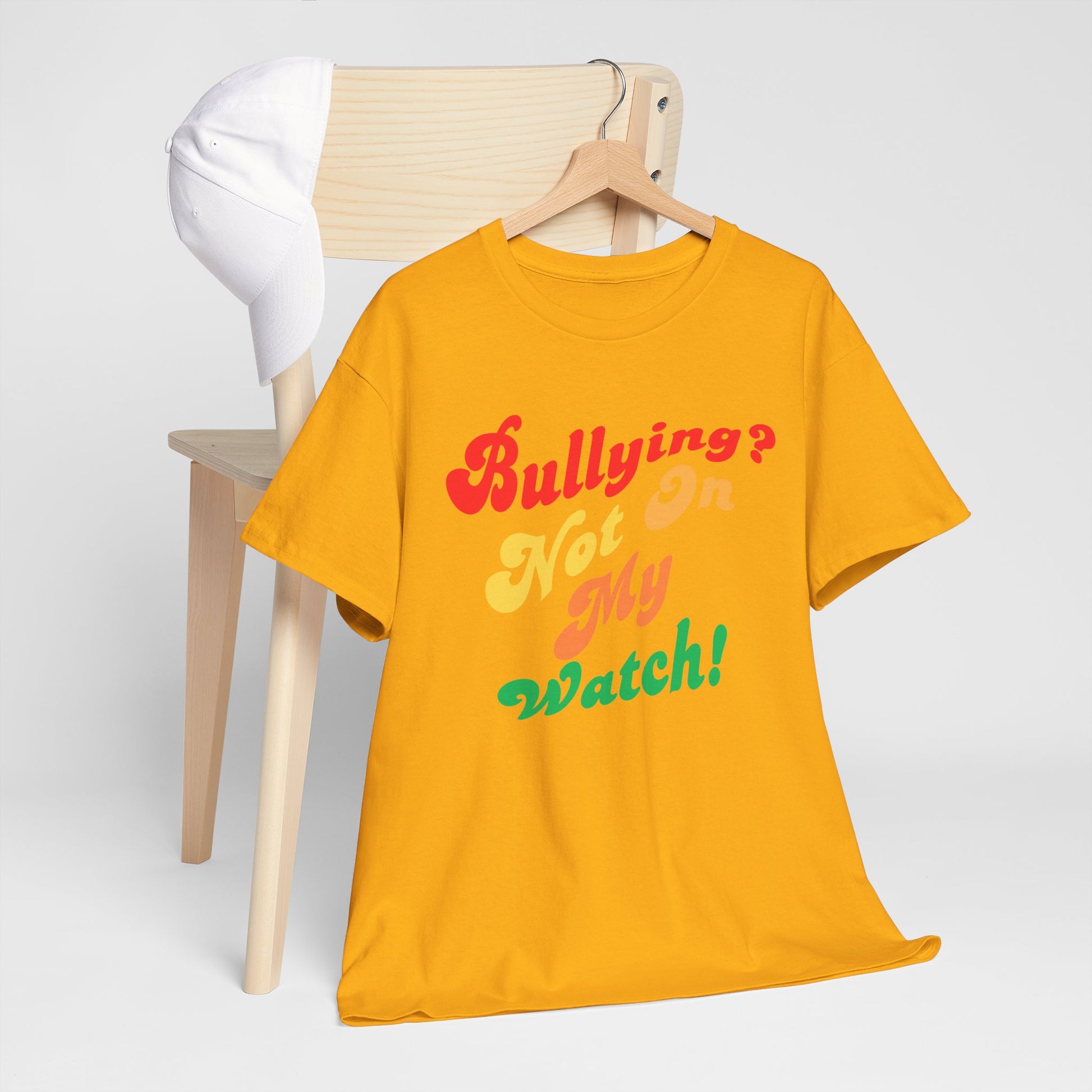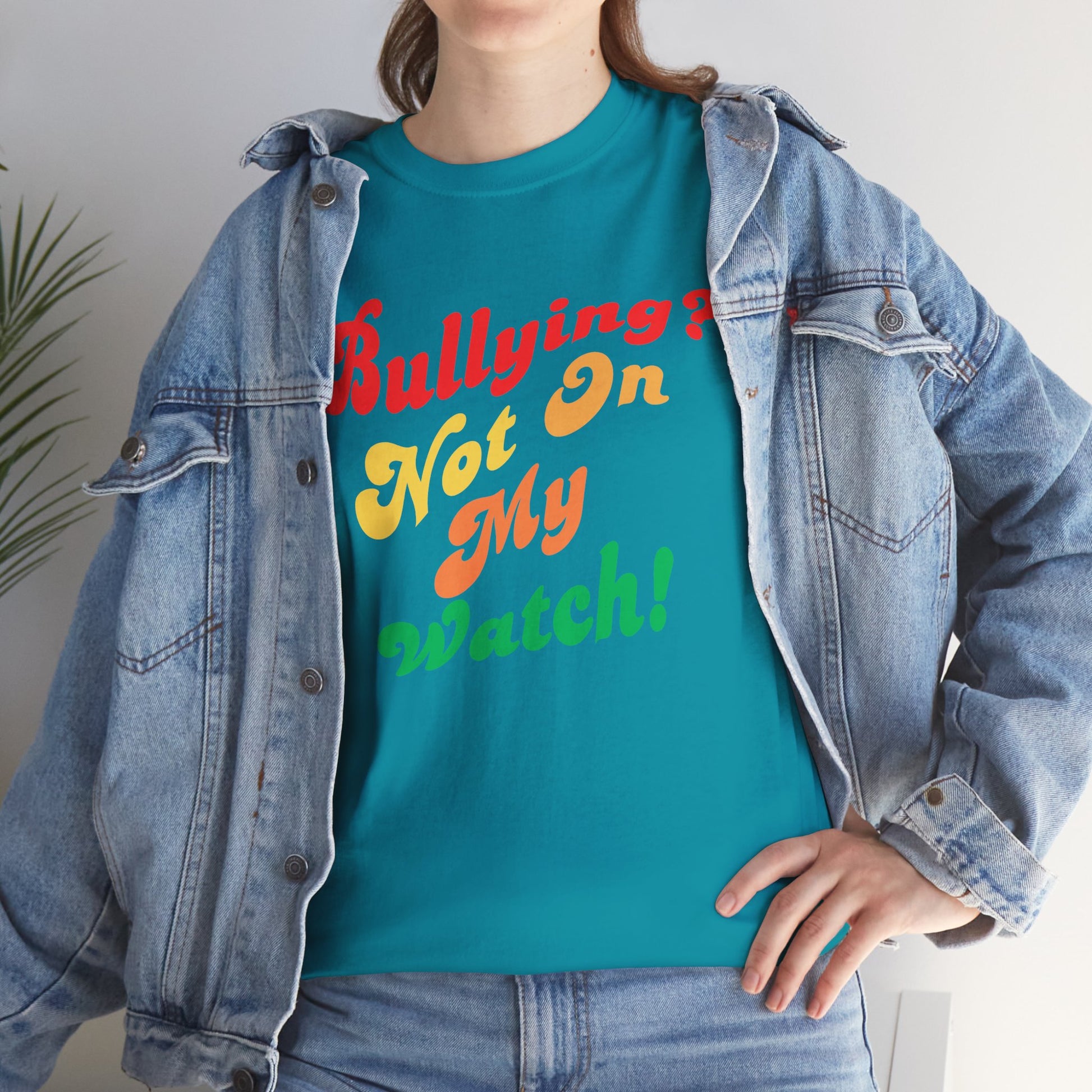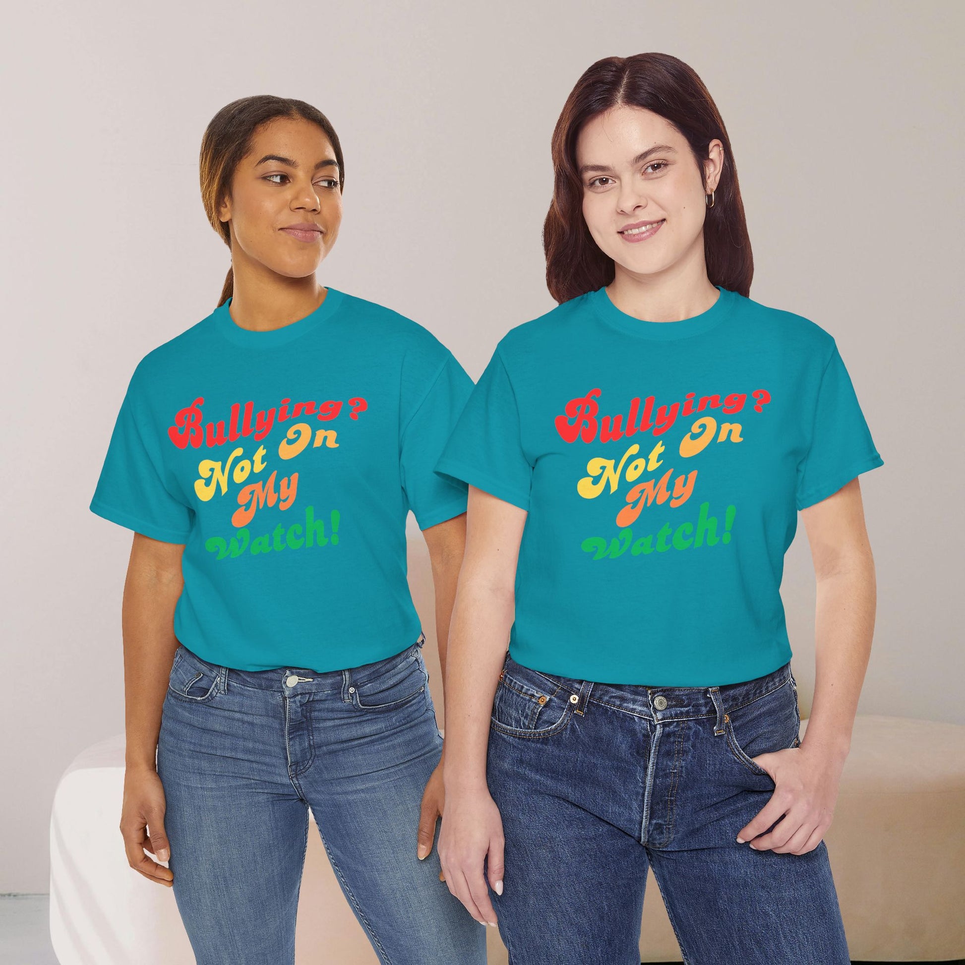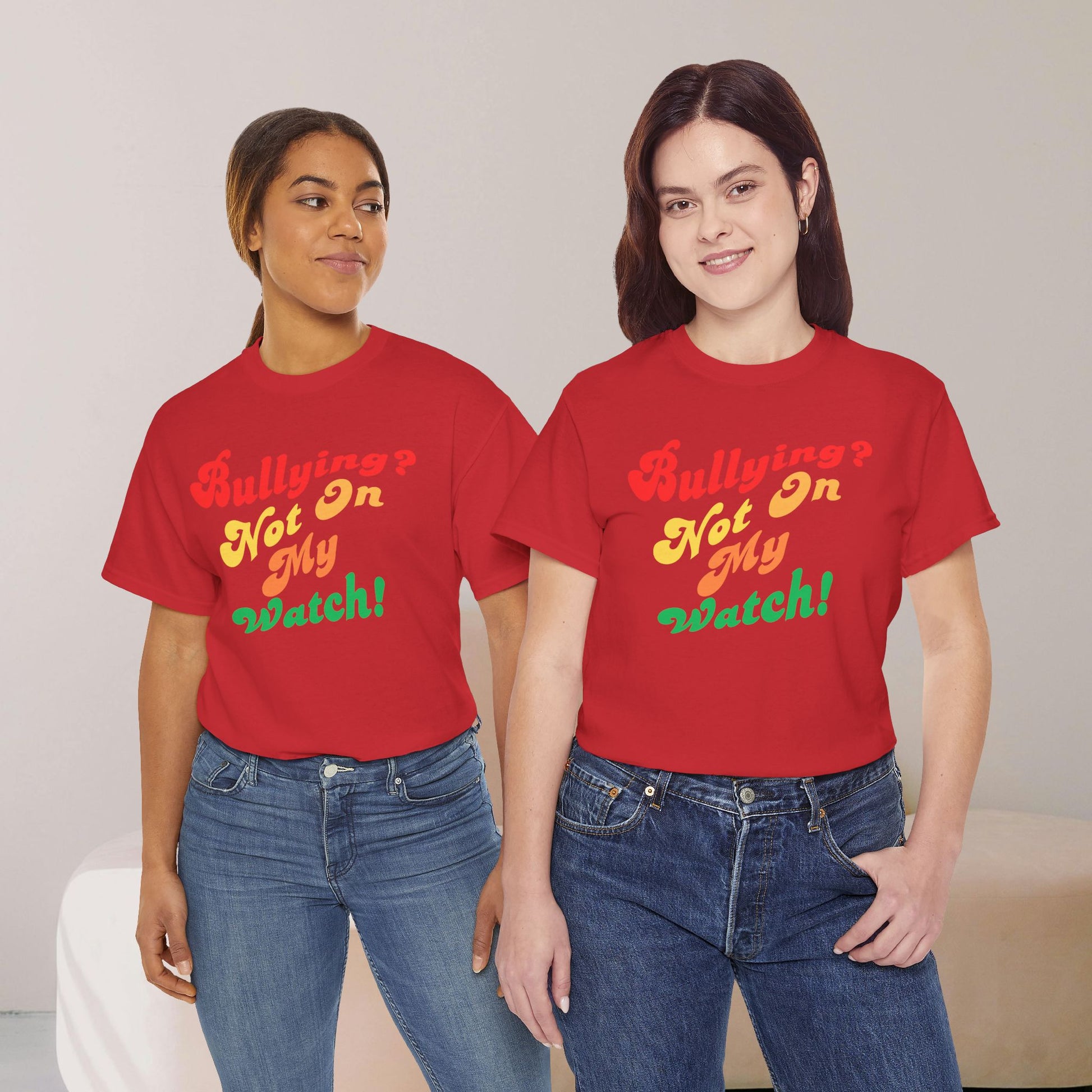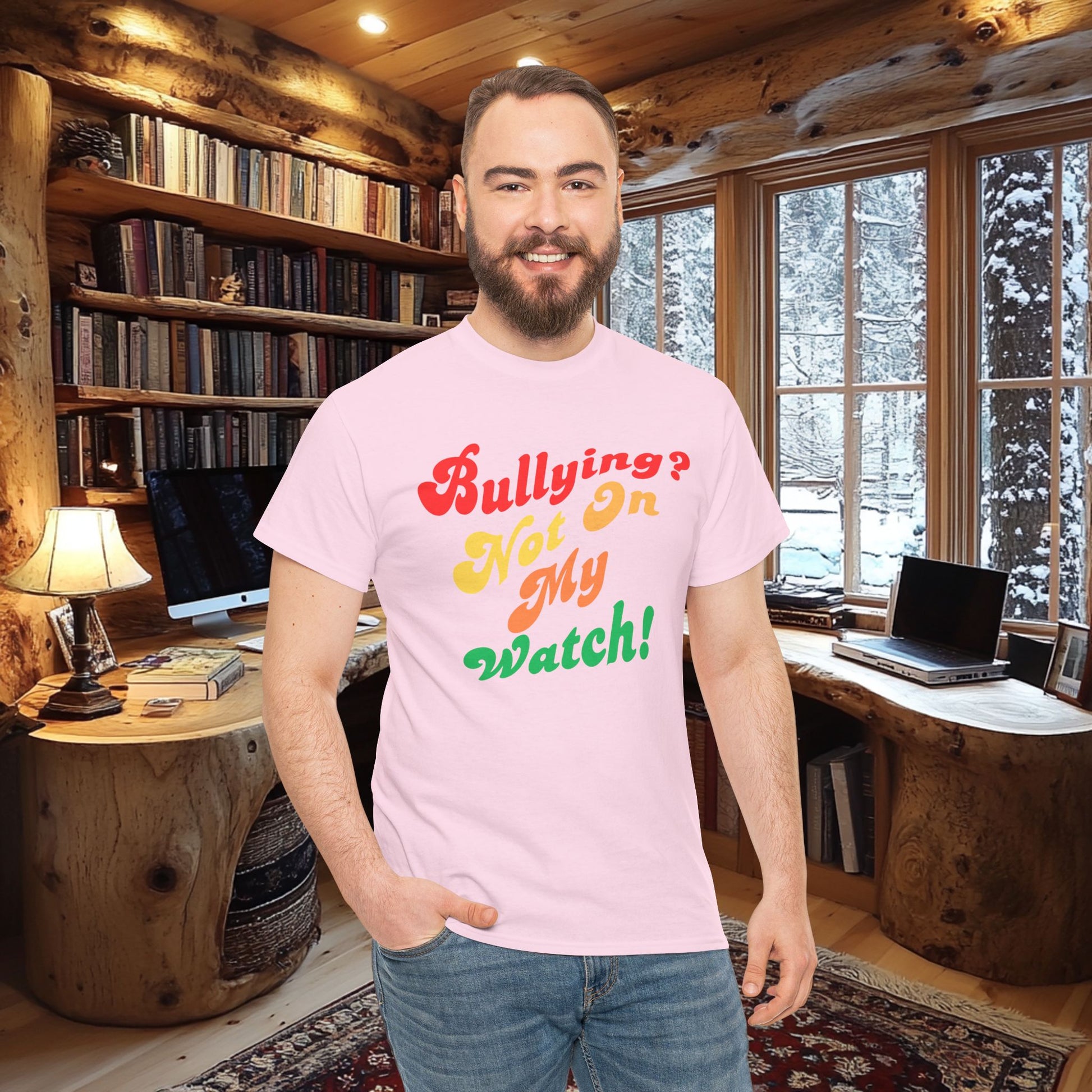 Help stop the bullying! The unisex heavy cotton tee is the basic staple of any wardrobe. It is the foundation upon which casual fashion grows. All it needs is a personalized design to elevate things to profitability. The specially spun fibers provide a smooth surface for premium printing vividity and sharpness. No side seams mean there are no itchy interruptions under the arms. The shoulders have tape for improved durability.