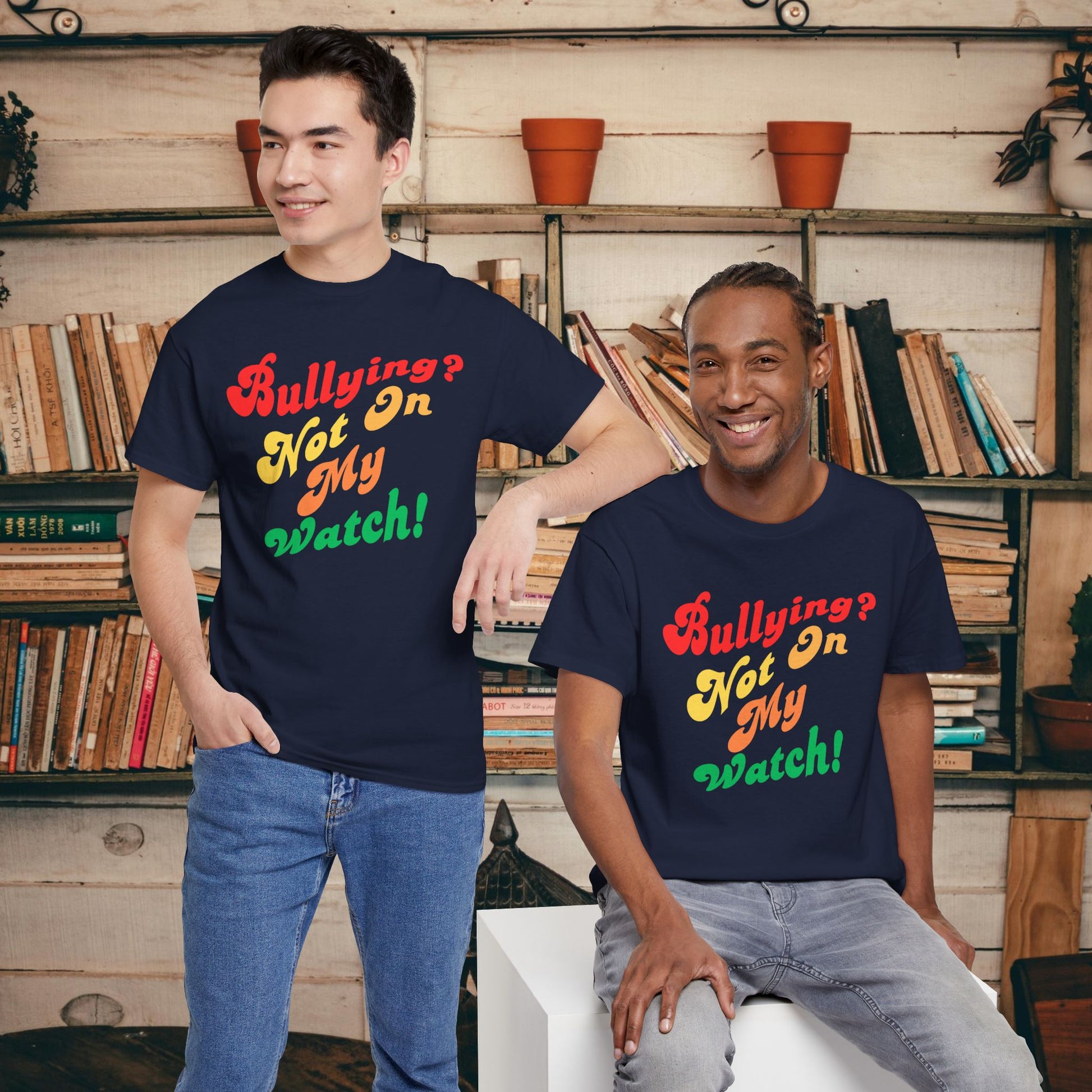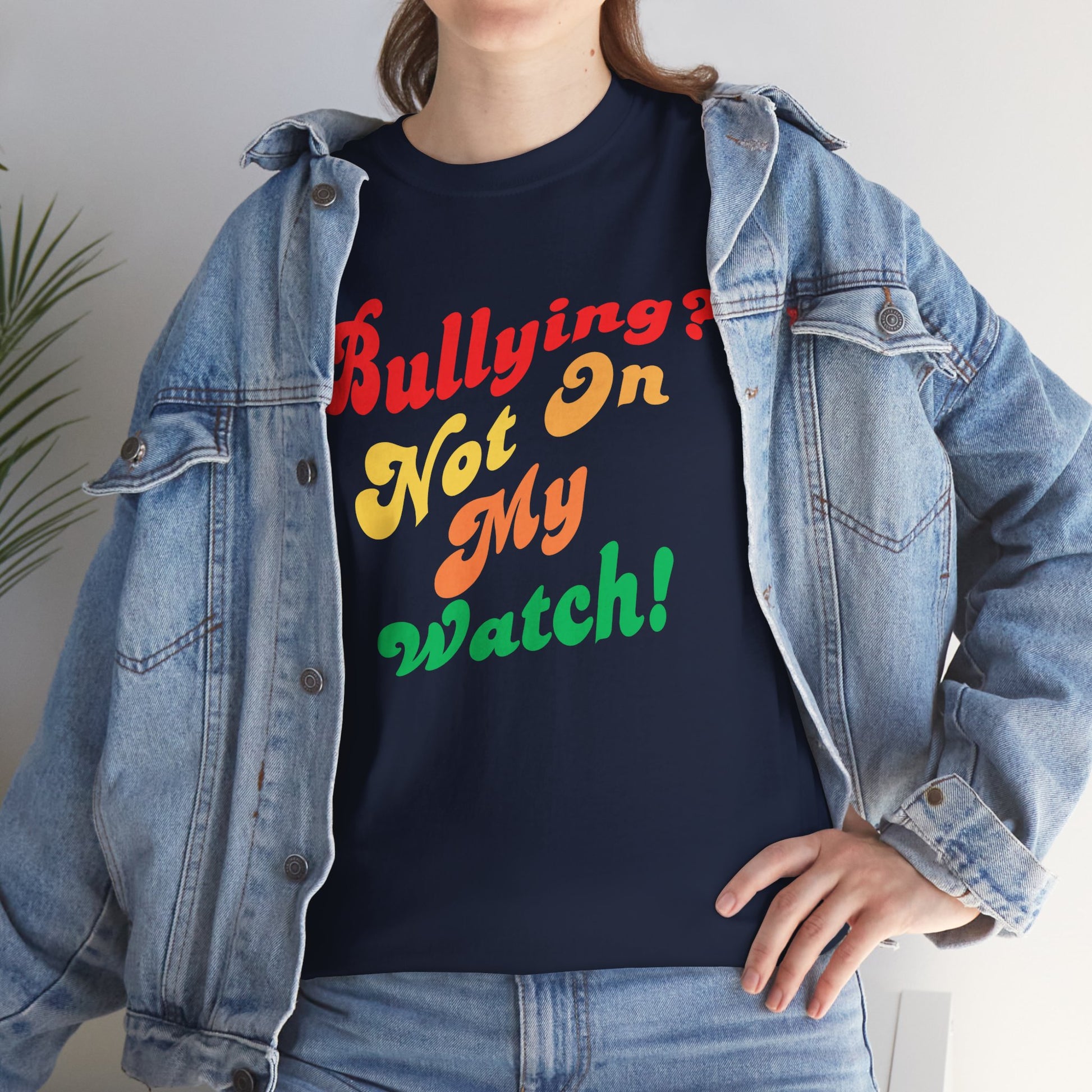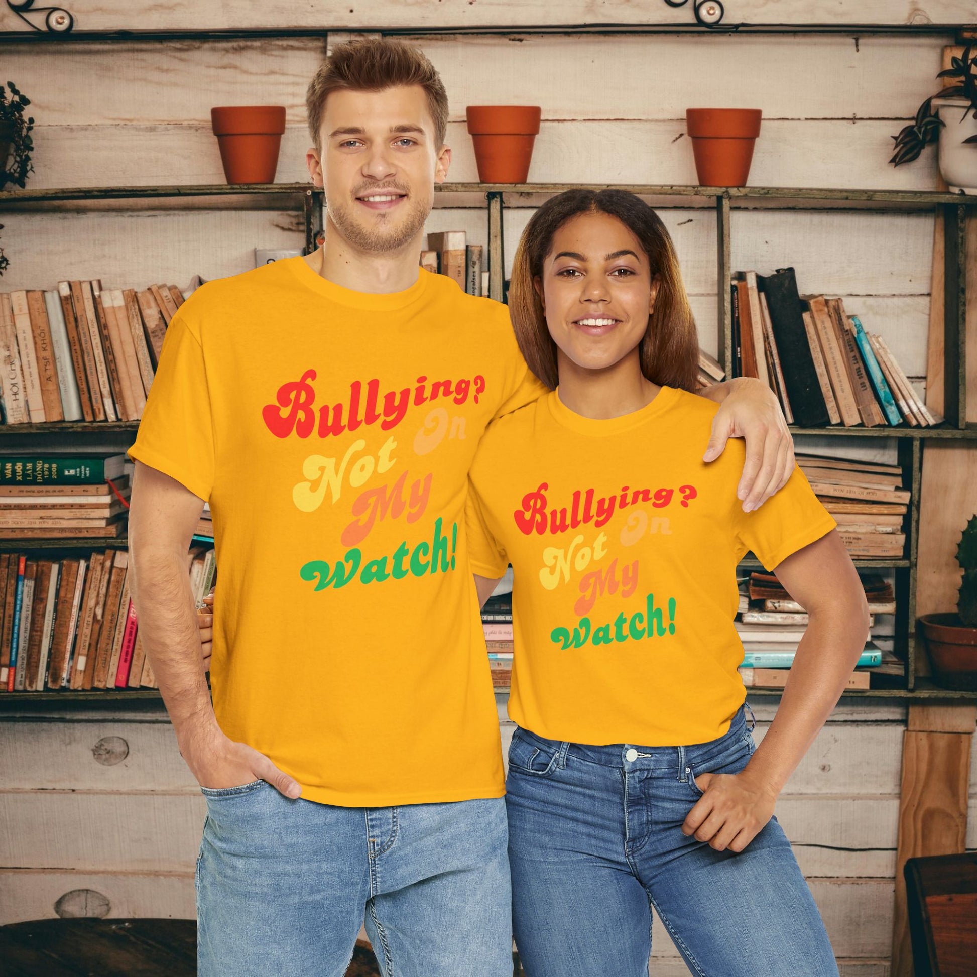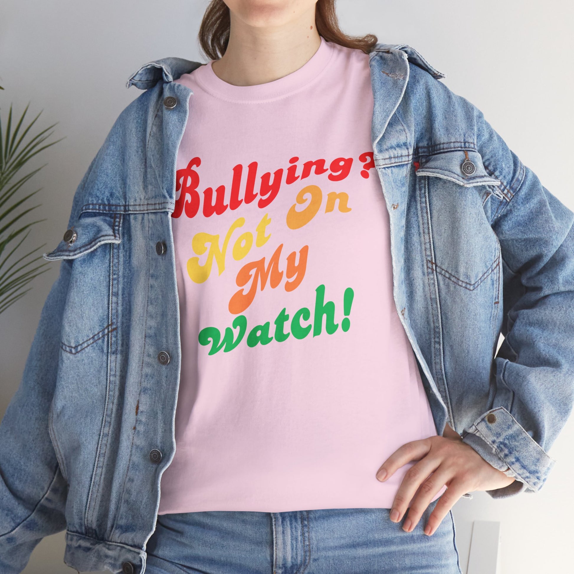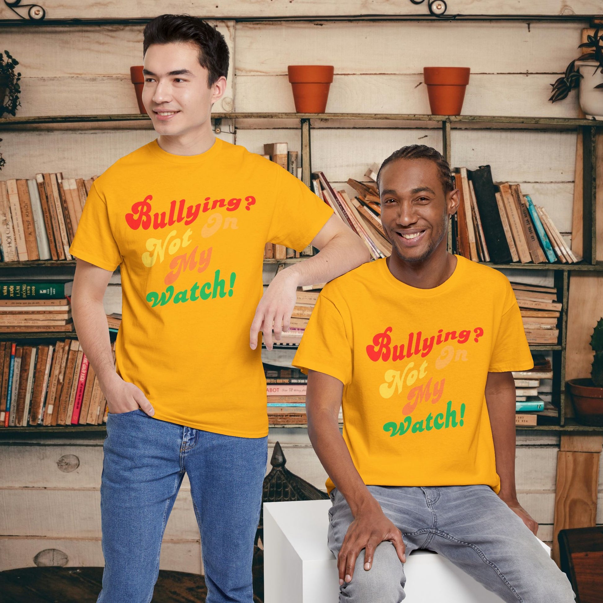 Help stop the bullying! The unisex heavy cotton tee is the basic staple of any wardrobe. It is the foundation upon which casual fashion grows. All it needs is a personalized design to elevate things to profitability. The specially spun fibers provide a smooth surface for premium printing vividity and sharpness. No side seams mean there are no itchy interruptions under the arms. The shoulders have tape for improved durability.