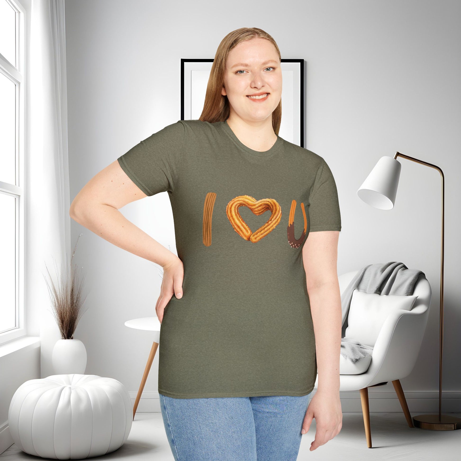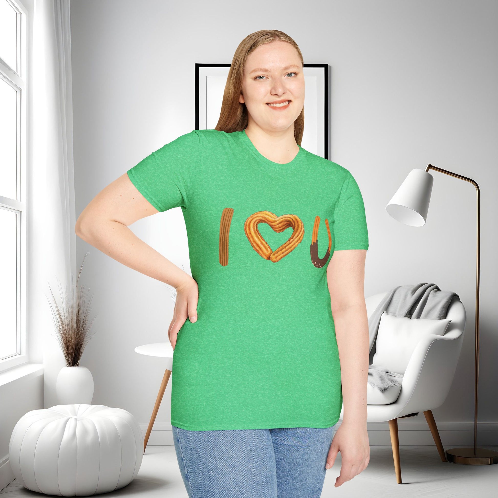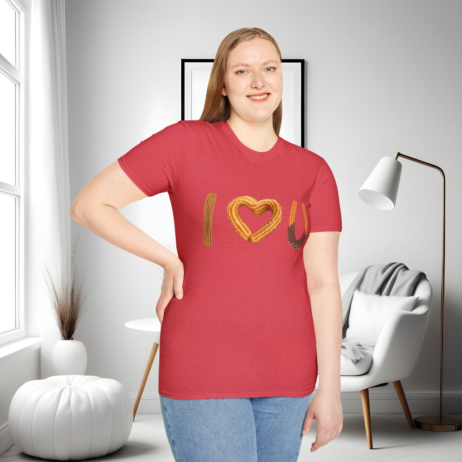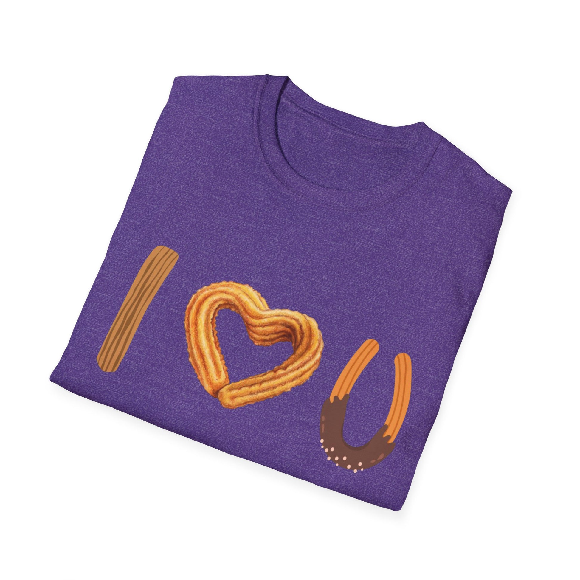 I love U and I love Churros! Churros is a popular pastry and is quite delicious! This shirt represents the love for churros and yes, even shows how much we love someone! The unisex soft-style t-shirt puts a new spin on casual comfort. Made from very soft materials, this tee is 100% cotton for solid colors. Heather colors and sports grey include polyester. The shoulders have twill tape for improved durability. There are no side seams. The collar is made with ribbed knitting to prevent curling damage.