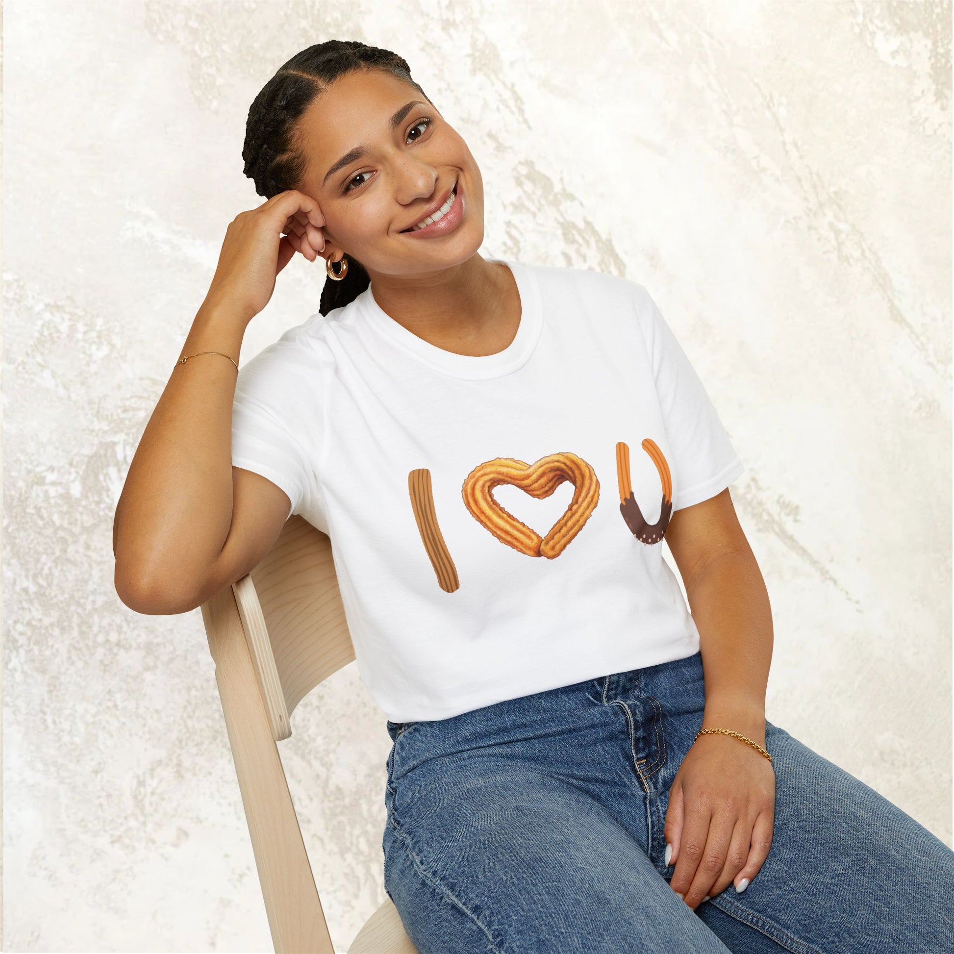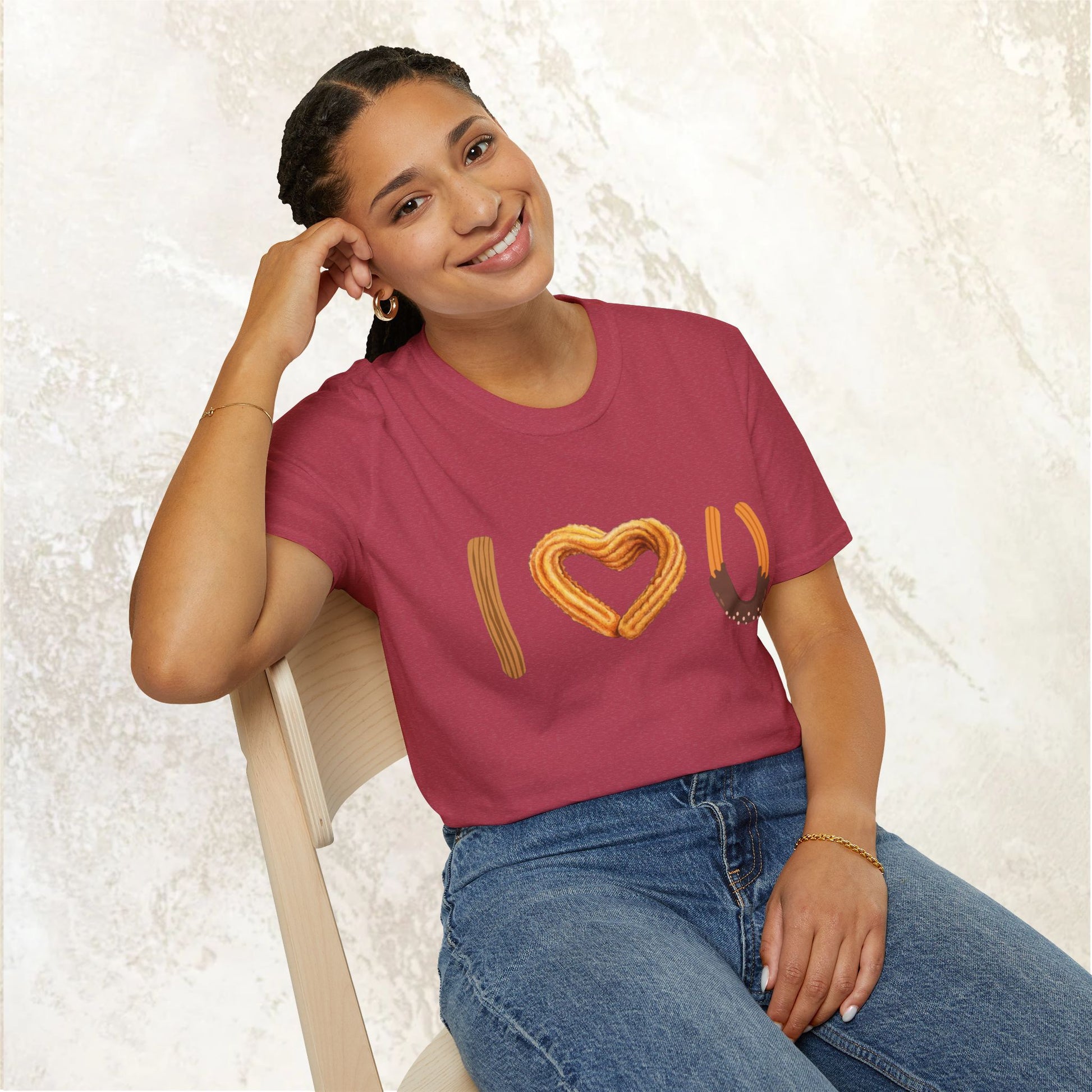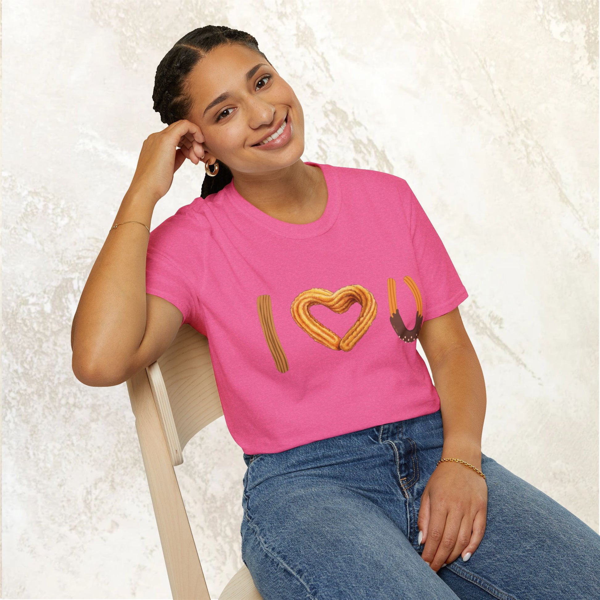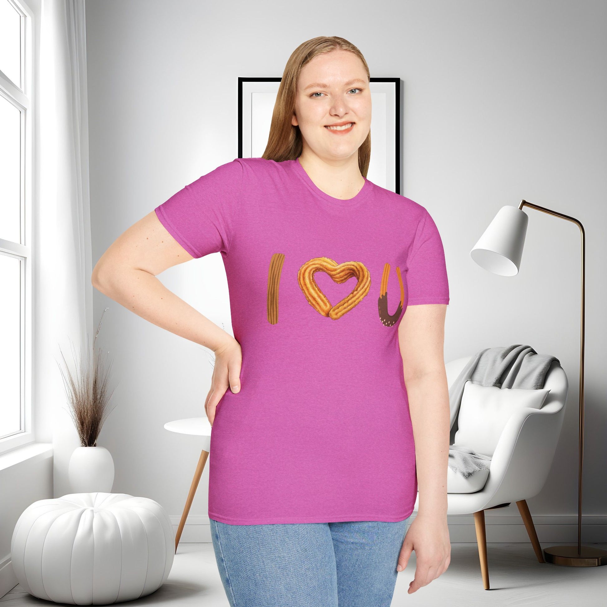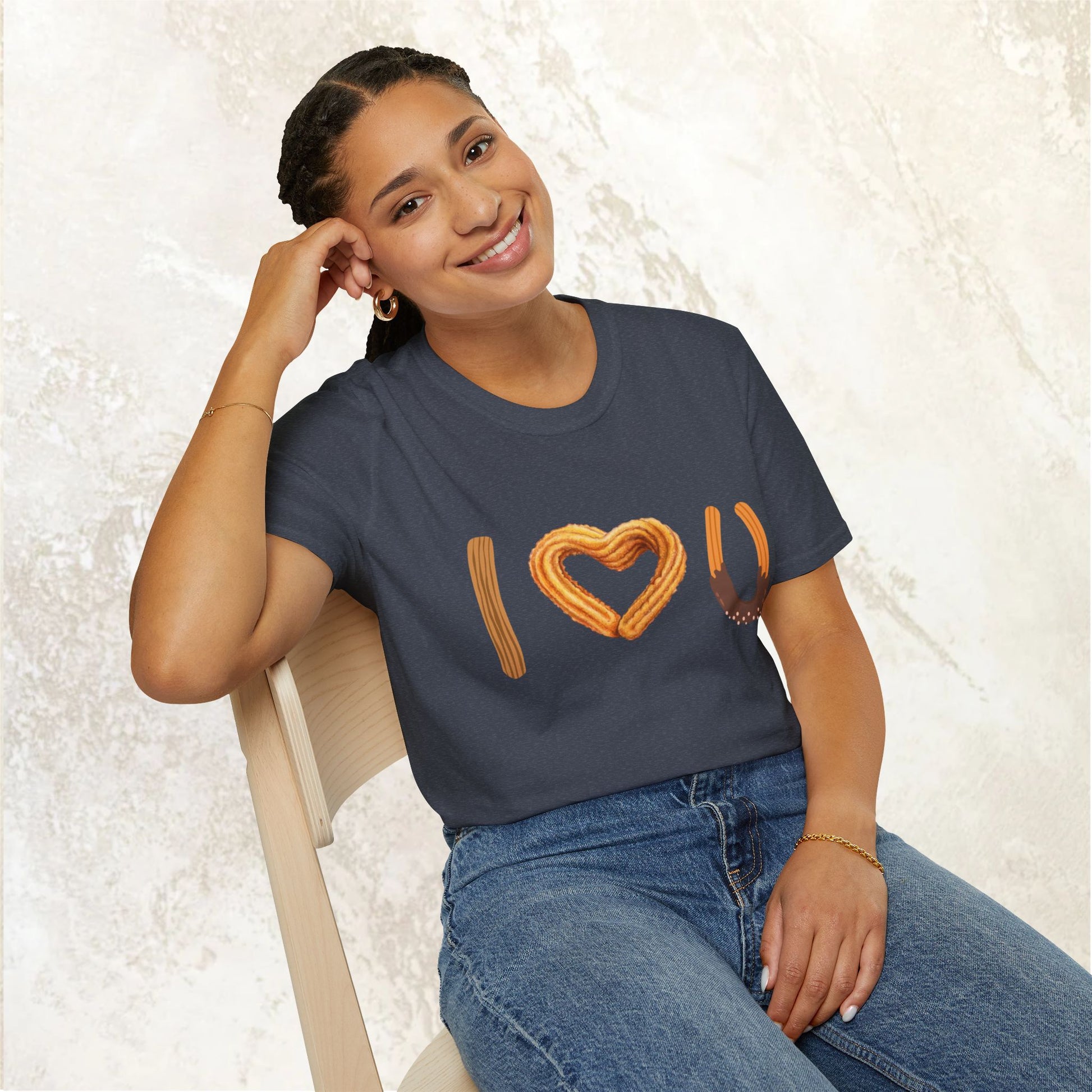 I love U and I love Churros! Churros is a popular pastry and is quite delicious! This shirt represents the love for churros and yes, even shows how much we love someone! The unisex soft-style t-shirt puts a new spin on casual comfort. Made from very soft materials, this tee is 100% cotton for solid colors. Heather colors and sports grey include polyester. The shoulders have twill tape for improved durability. There are no side seams. The collar is made with ribbed knitting to prevent curling damage.