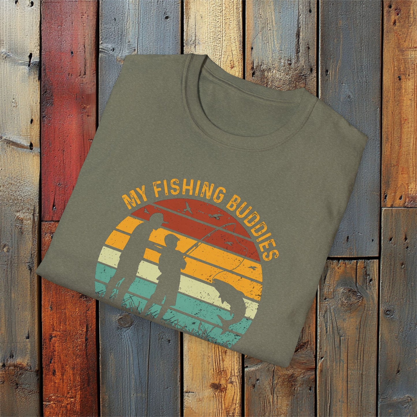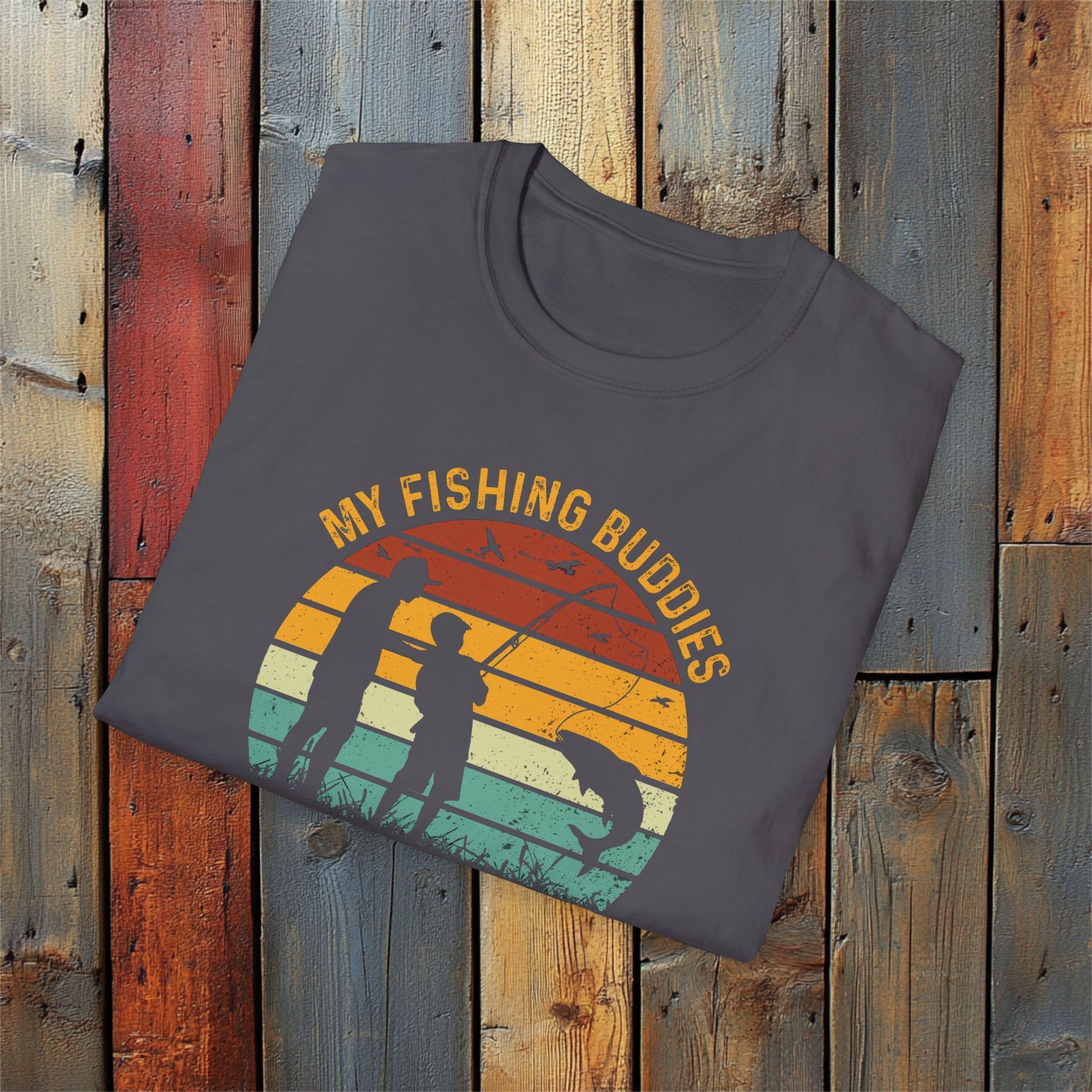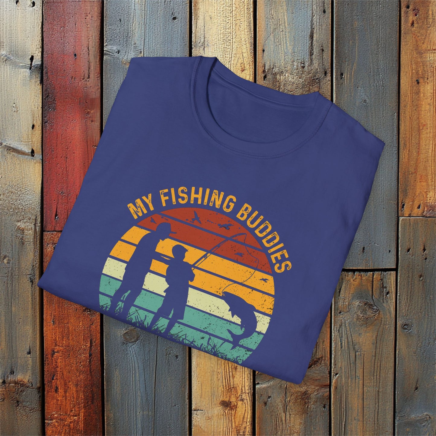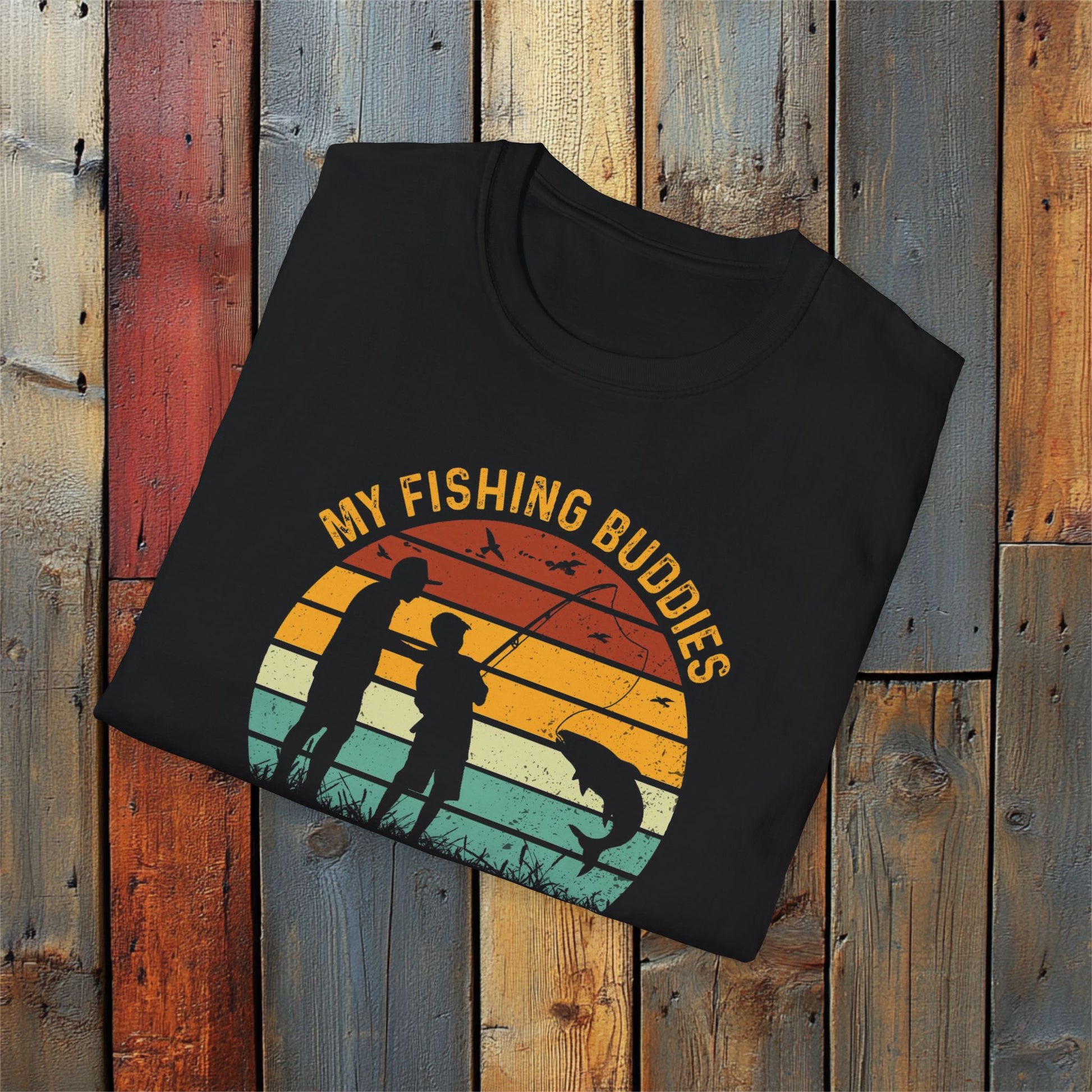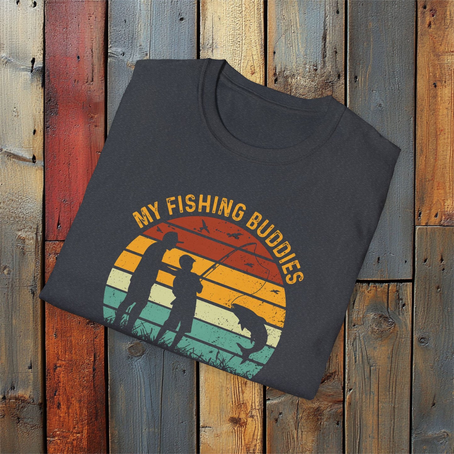 Let's go fishing with dad! A great gift for a great person! The unisex soft-style t-shirt puts a new spin on casual comfort. Made from very soft materials, this tee is 100% cotton for solid colors. Heather colors and sports grey include polyester. The shoulders have twill tape for improved durability. There are no side seams. The collar is made with ribbed knitting to prevent curling damage.