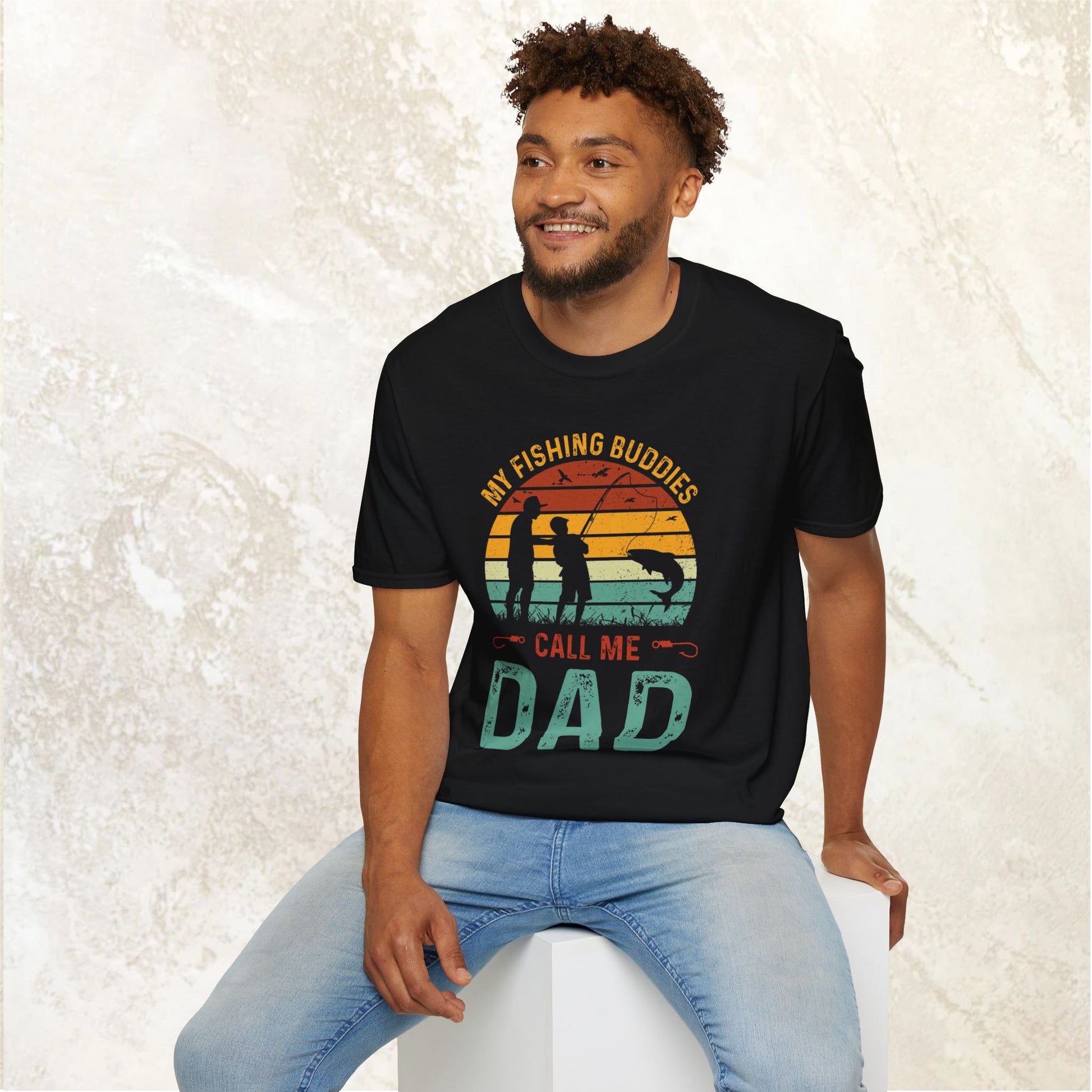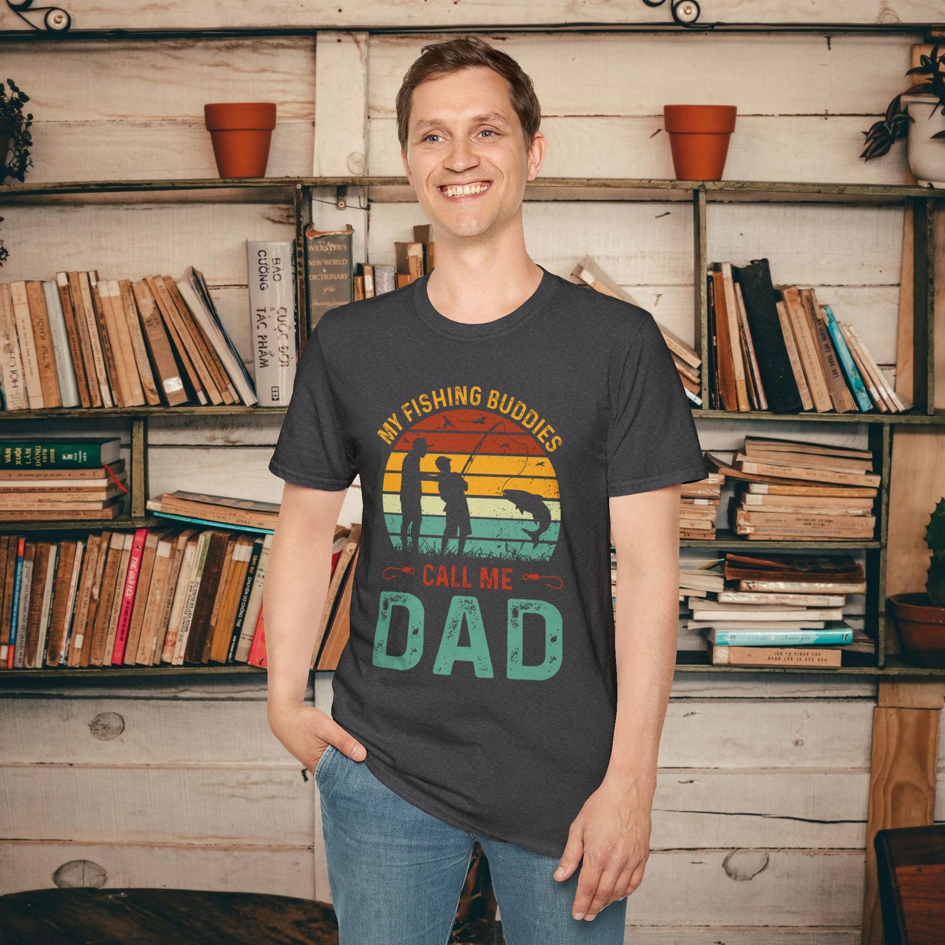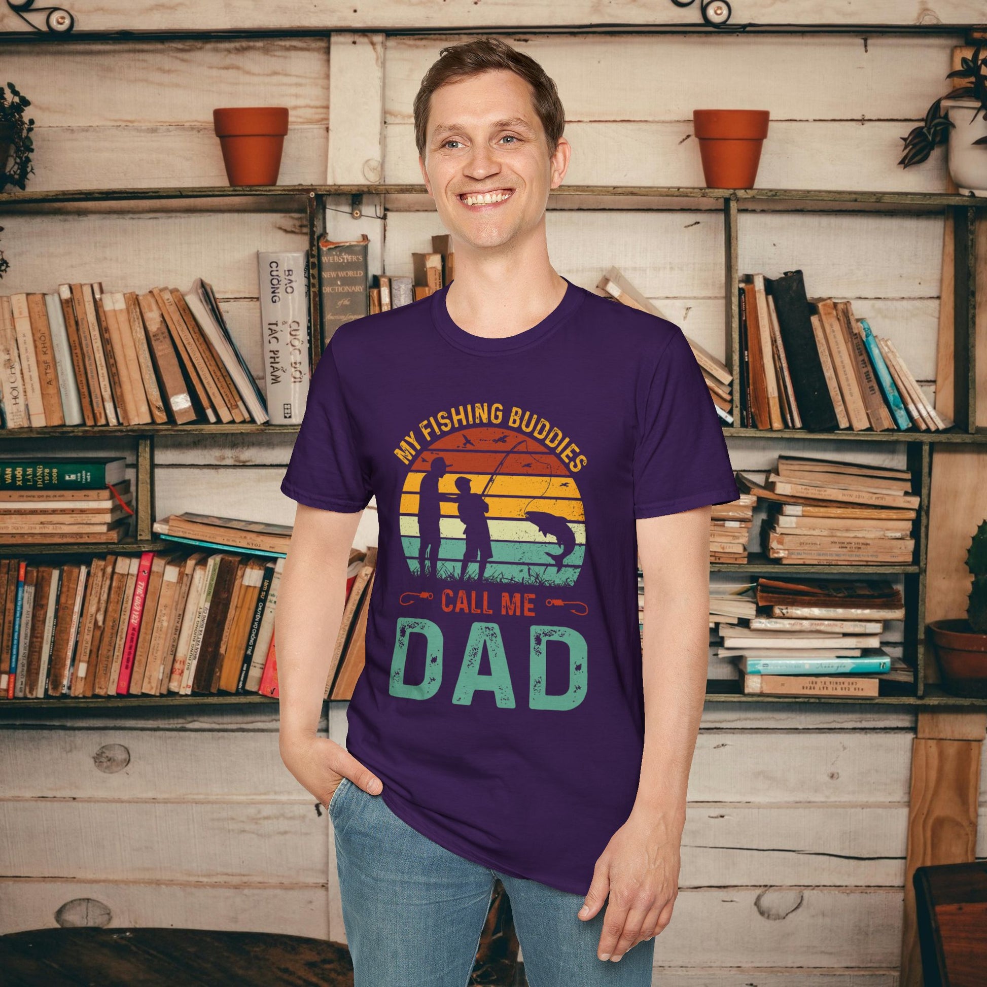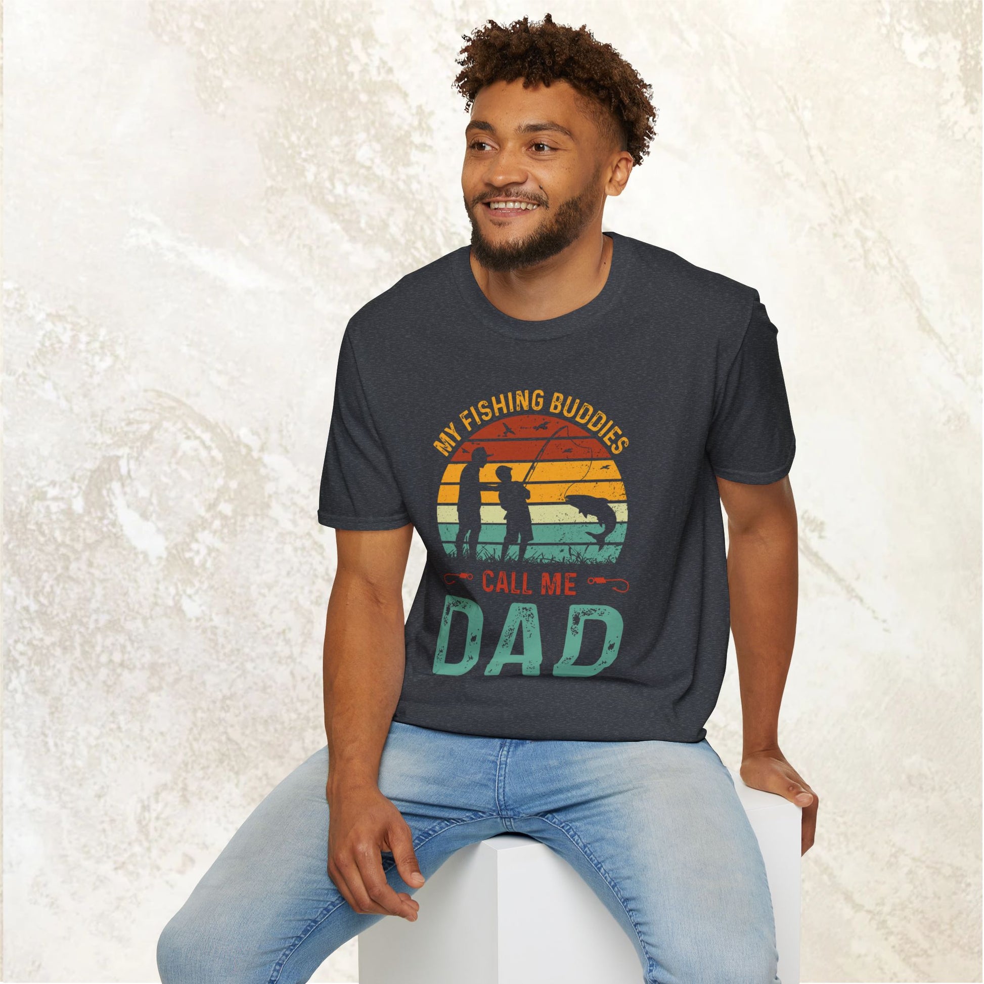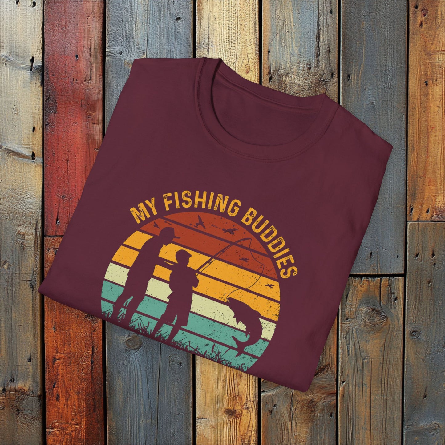 Let's go fishing with dad! A great gift for a great person! The unisex soft-style t-shirt puts a new spin on casual comfort. Made from very soft materials, this tee is 100% cotton for solid colors. Heather colors and sports grey include polyester. The shoulders have twill tape for improved durability. There are no side seams. The collar is made with ribbed knitting to prevent curling damage.