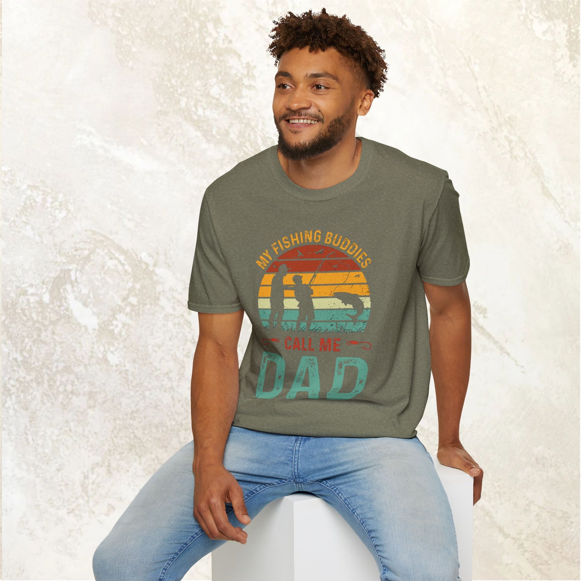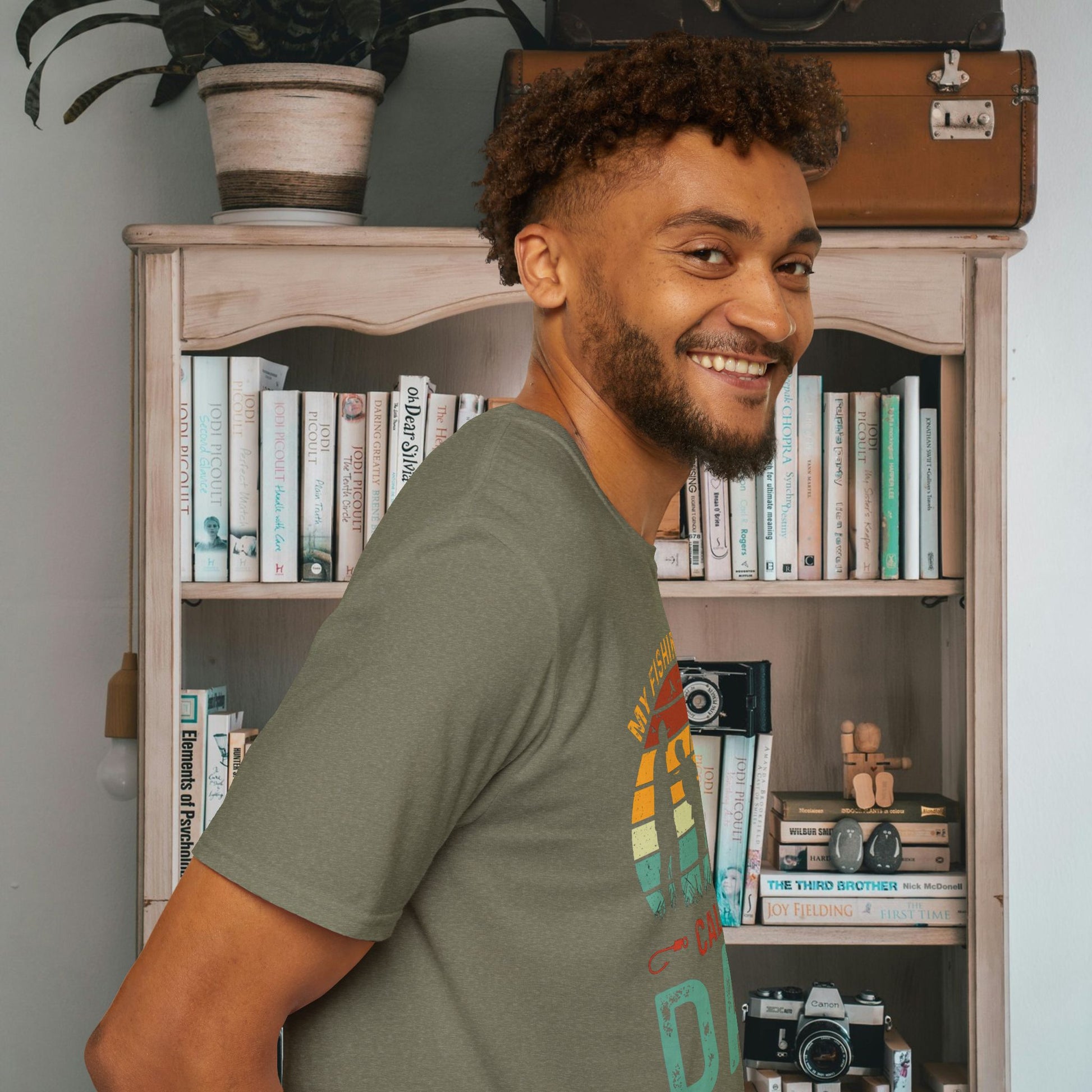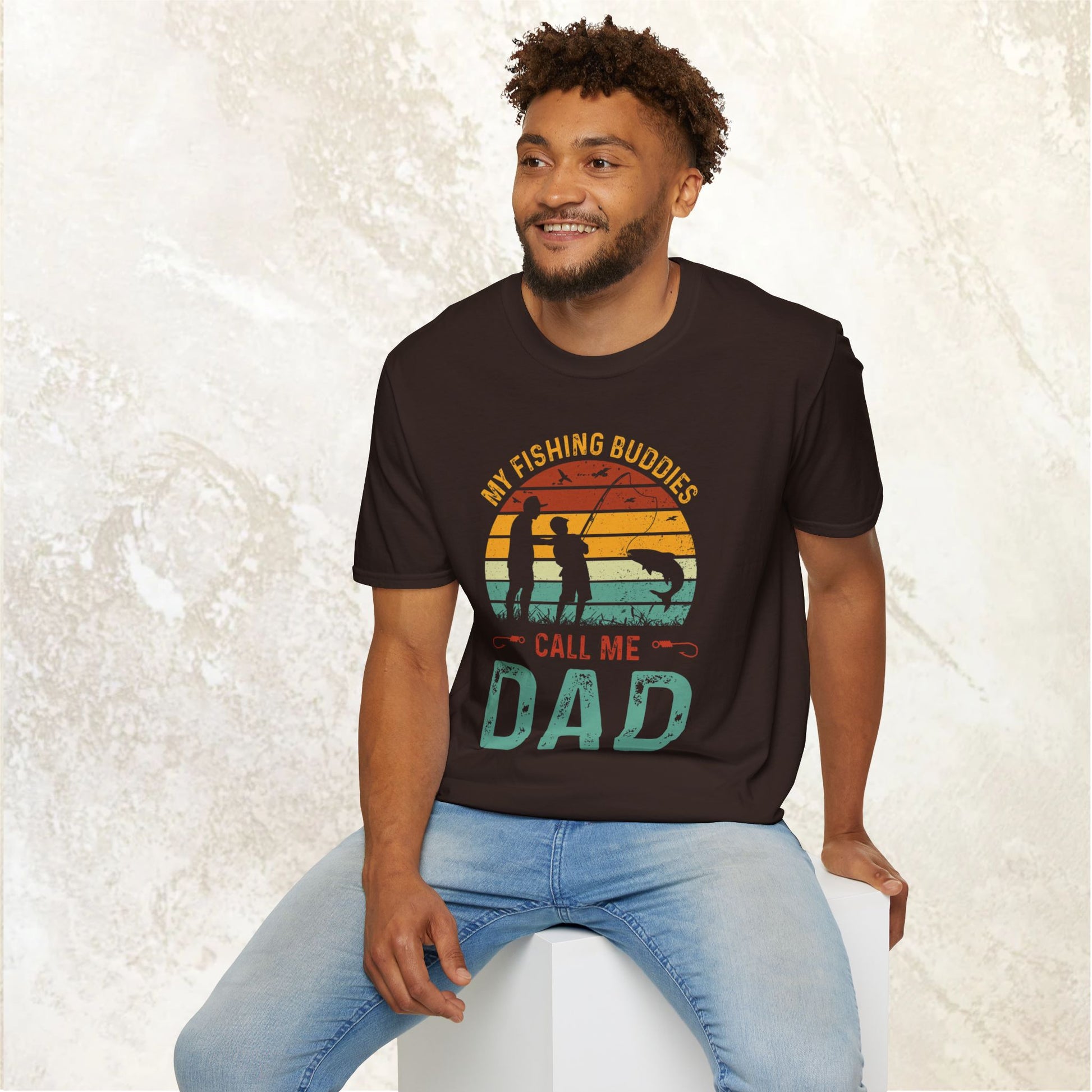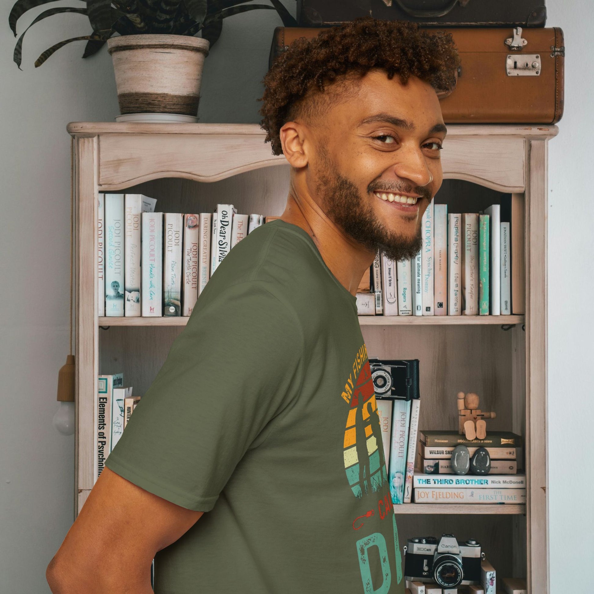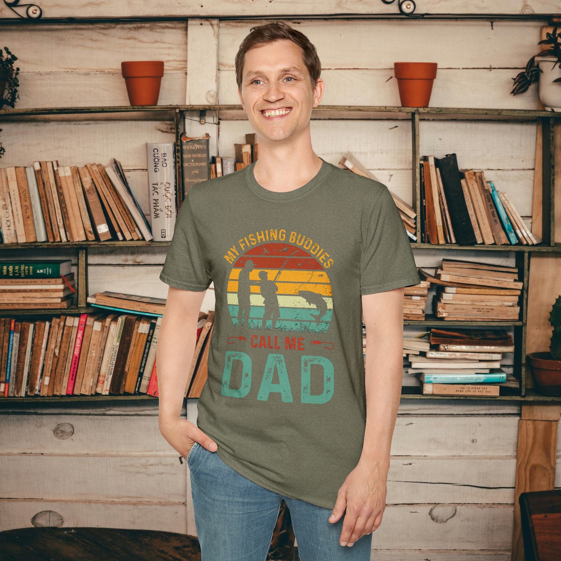 Let's go fishing with dad! A great gift for a great person! The unisex soft-style t-shirt puts a new spin on casual comfort. Made from very soft materials, this tee is 100% cotton for solid colors. Heather colors and sports grey include polyester. The shoulders have twill tape for improved durability. There are no side seams. The collar is made with ribbed knitting to prevent curling damage.