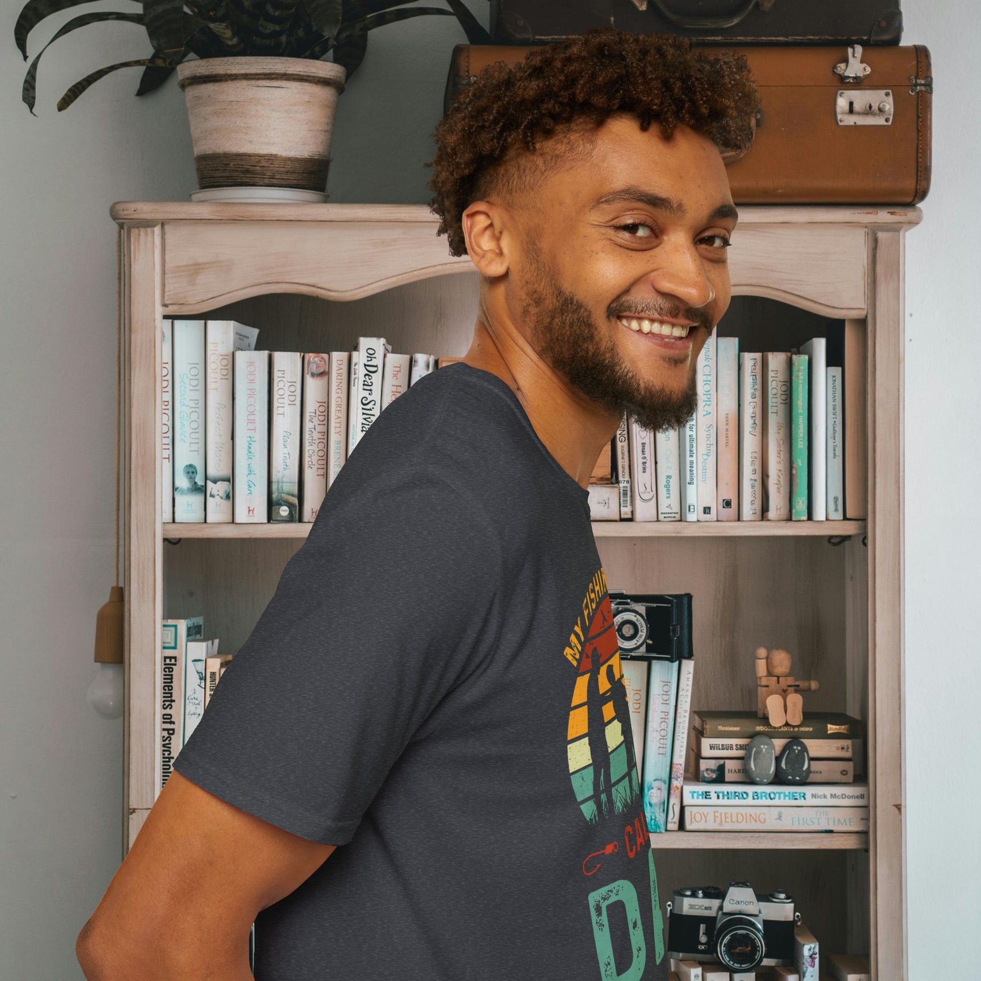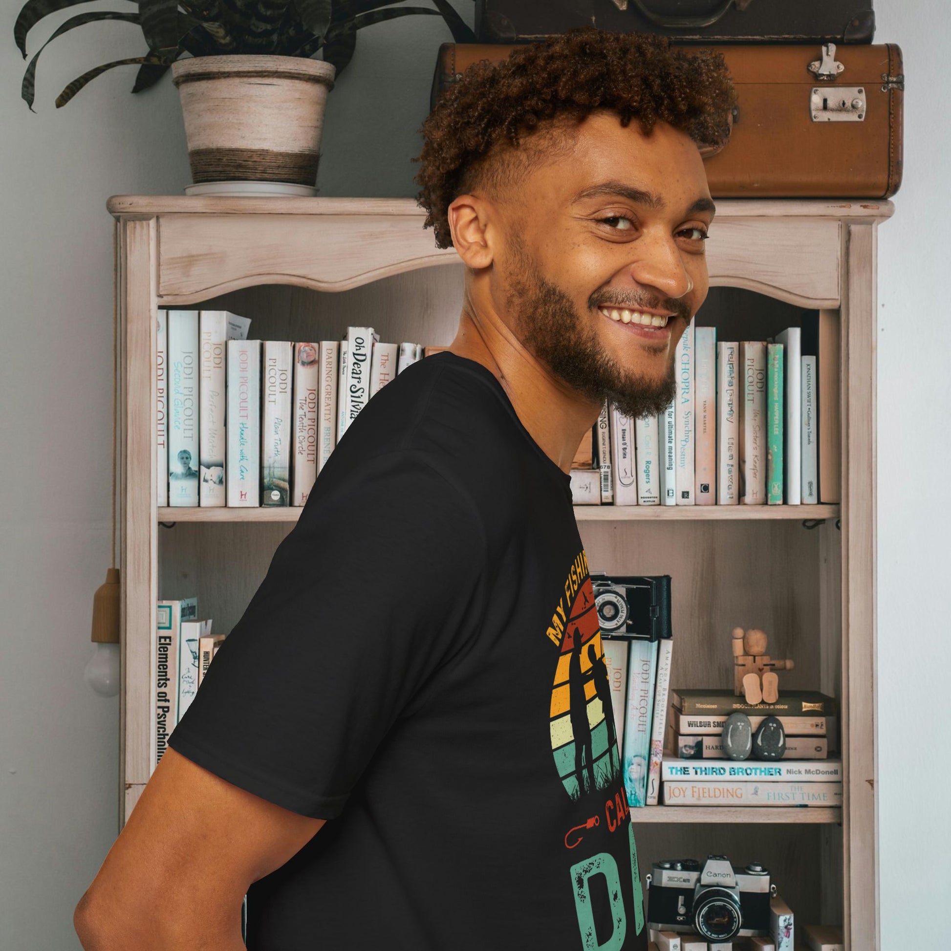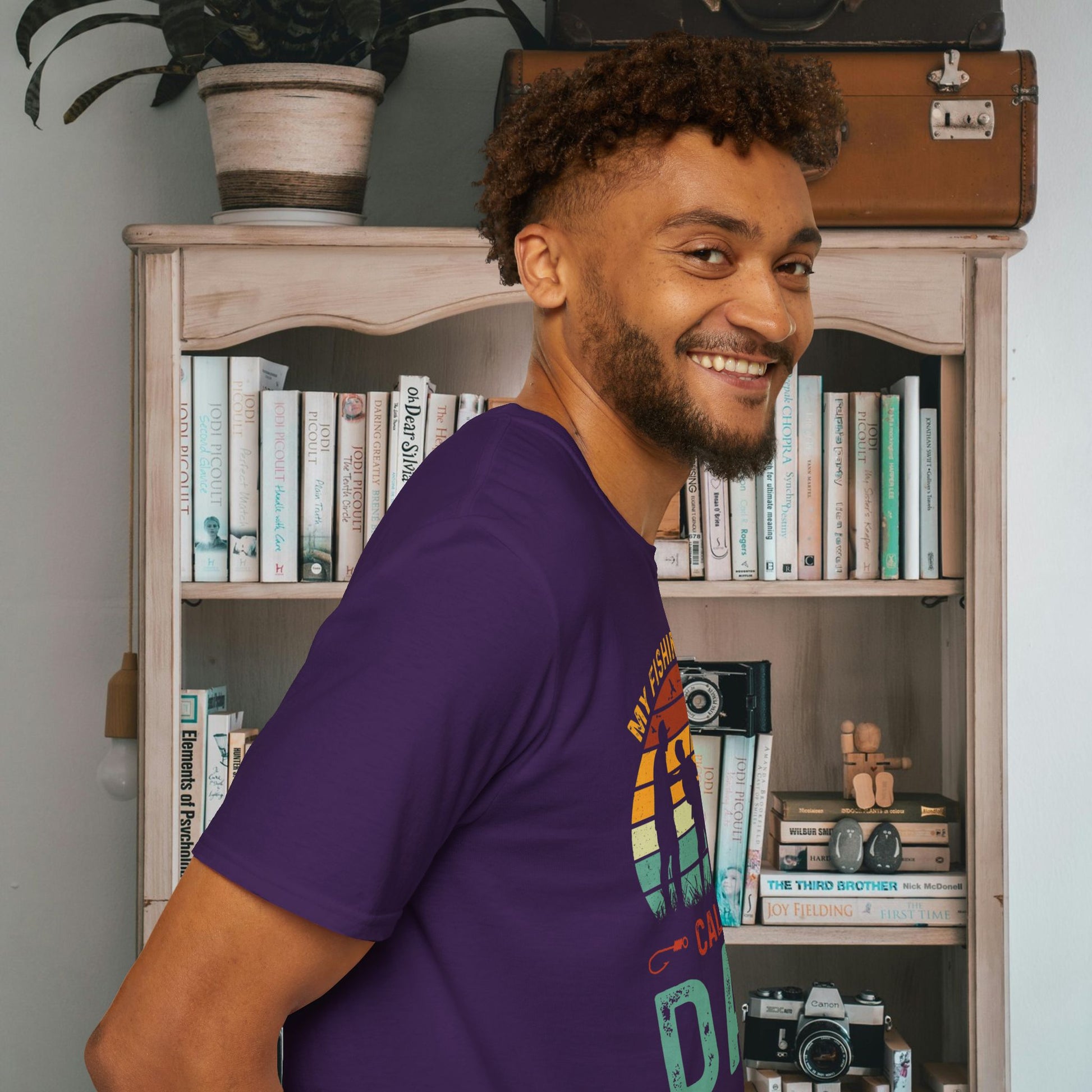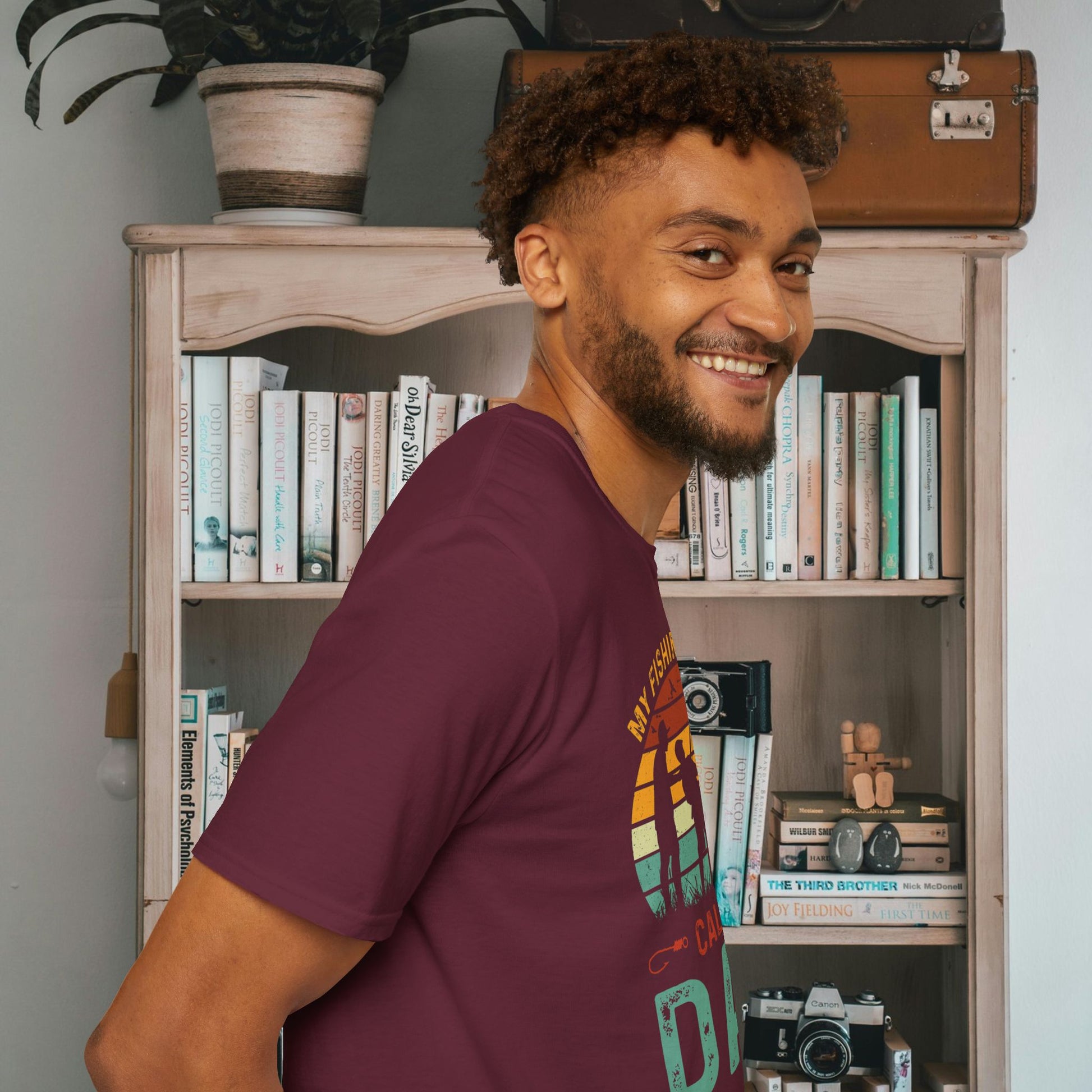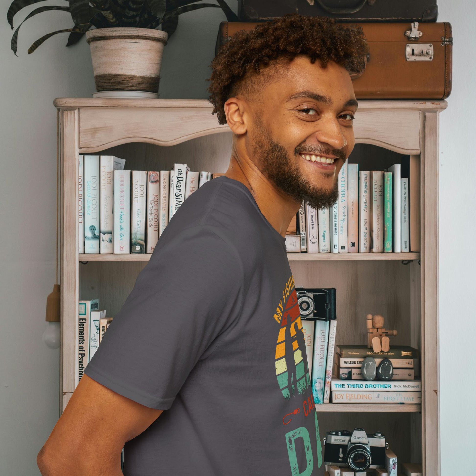 Let's go fishing with dad! A great gift for a great person! The unisex soft-style t-shirt puts a new spin on casual comfort. Made from very soft materials, this tee is 100% cotton for solid colors. Heather colors and sports grey include polyester. The shoulders have twill tape for improved durability. There are no side seams. The collar is made with ribbed knitting to prevent curling damage.